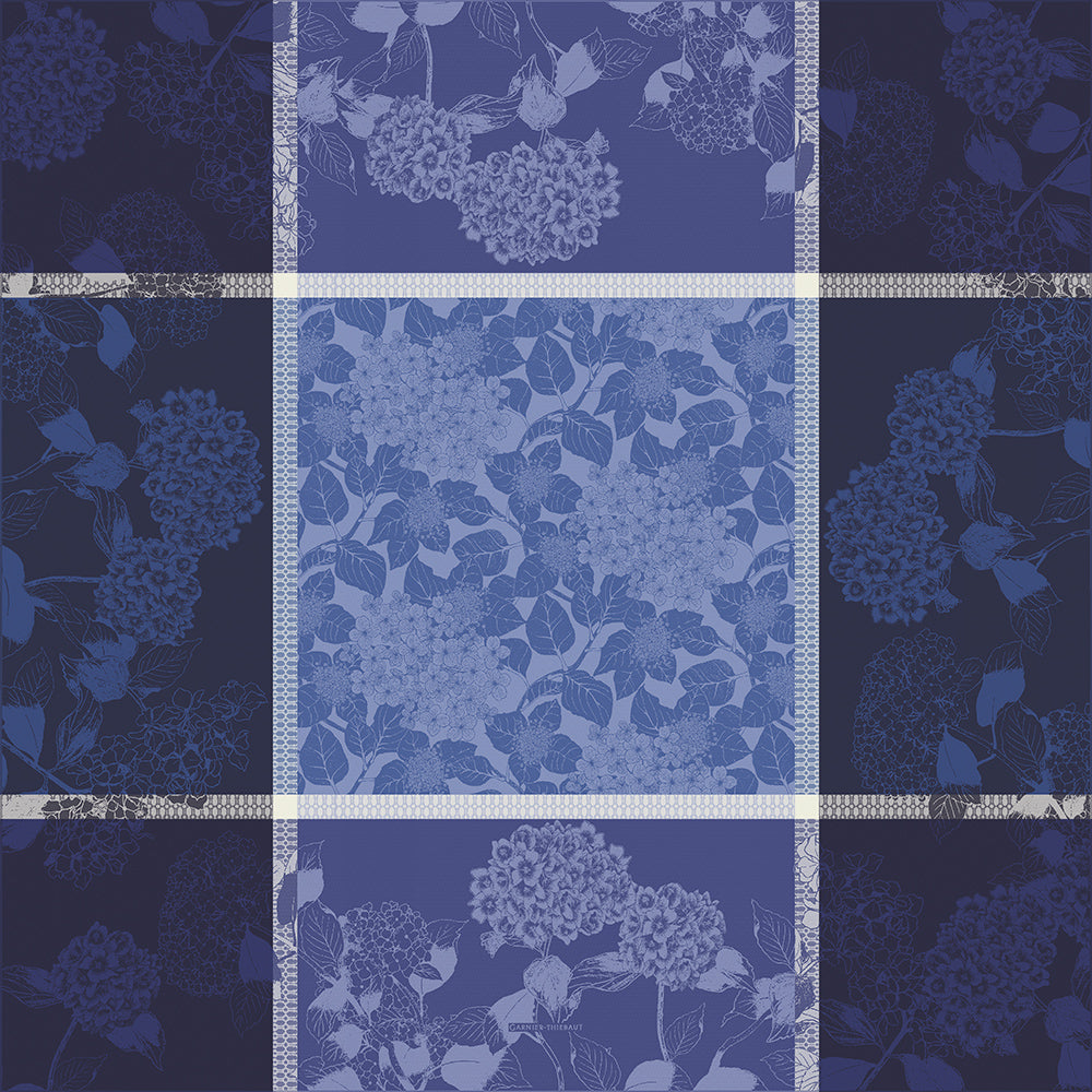 This Garnier-Thiebaut Hortensias Bleu Tablecloth is perfect for sophisticated entertaining. Made of Green Sweet organic cotton, it is naturally stain-resistant and machine washable for everyday use. Its unique design in large format hydrangeas on a blue background is sure to be an heirloom-quality piece that will last a lifetime.