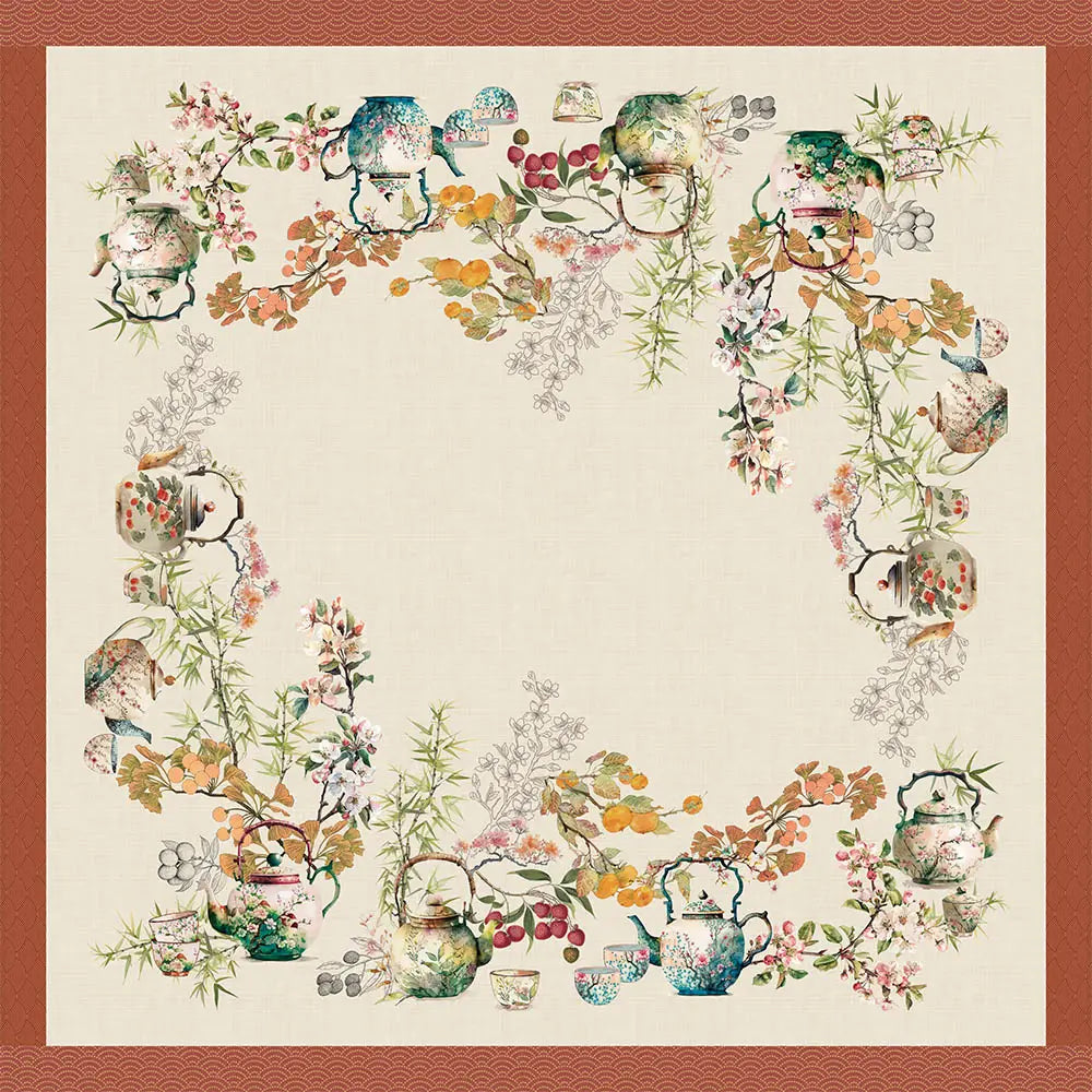 Theieres Rouille Collection showcases rich hues of red, golden yellow, green, and blue. This table linen is adorned with an Asian-inspired teapot design, brimming with blossoms and branches.