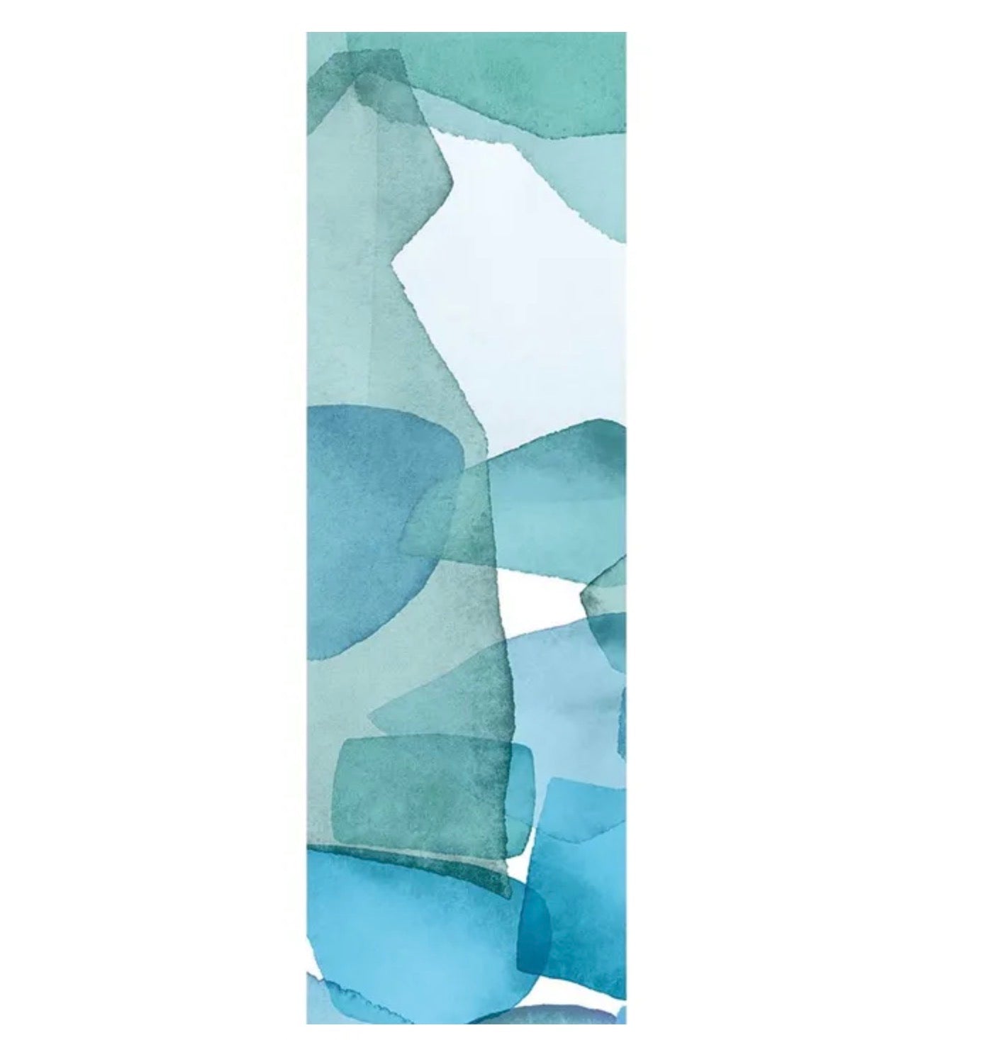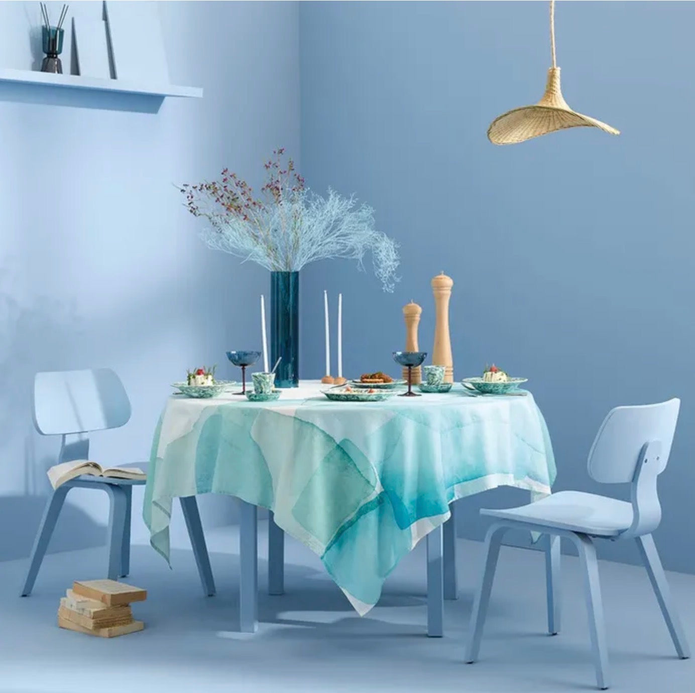 Aqua Mineral table runner features watercolor-inspired blue and green design. Made from cotton-linen blend by Garnier Thiebaut. Works for everyday dining and special occasions. Drapes gracefully on any table.