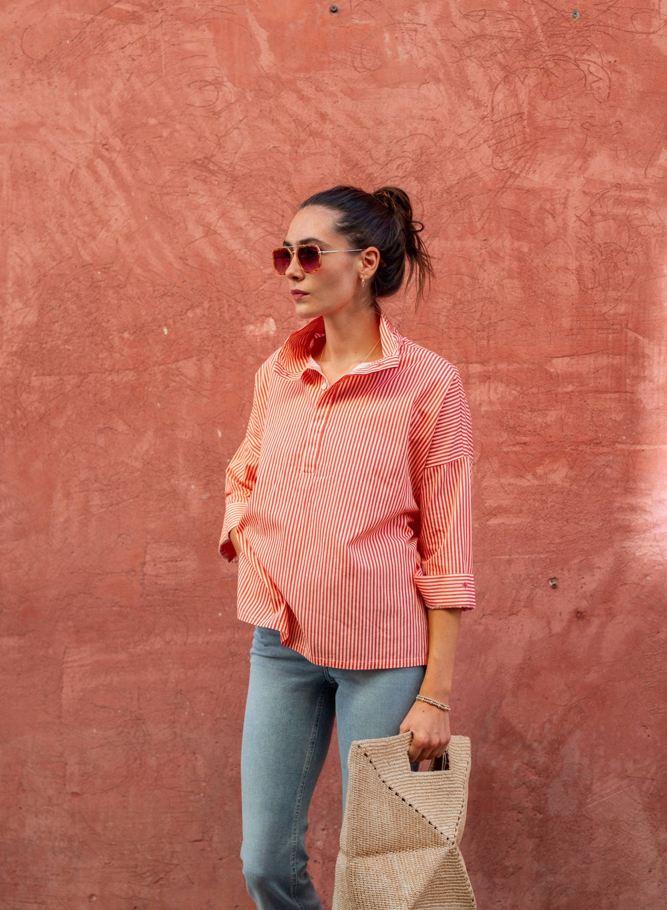 Emerson Pop Up Collar Top | Coral Rose Stripe