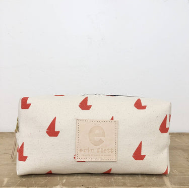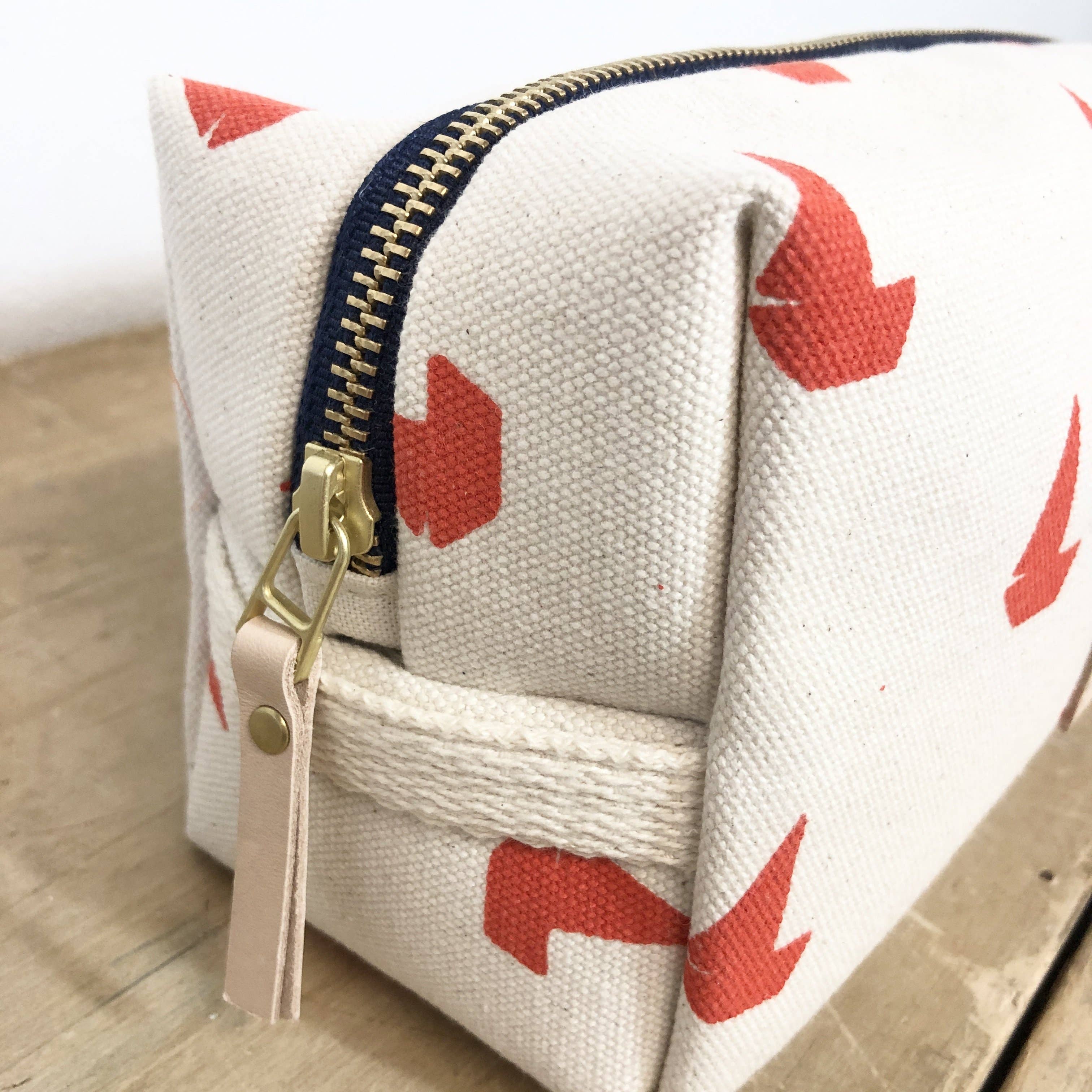 Specs: 9 1/2" x 4" x 5". Heavy canvas exterior. Full length inside pocket. Rip-stop nylon lining with contrasting seam piping. Cotton braid handles. USA industrial metal zipper. Leather bell pull. 100% made in Maine. USA woven fabric. Hand silk screened in Maine. Wipe clean / spot clean only.