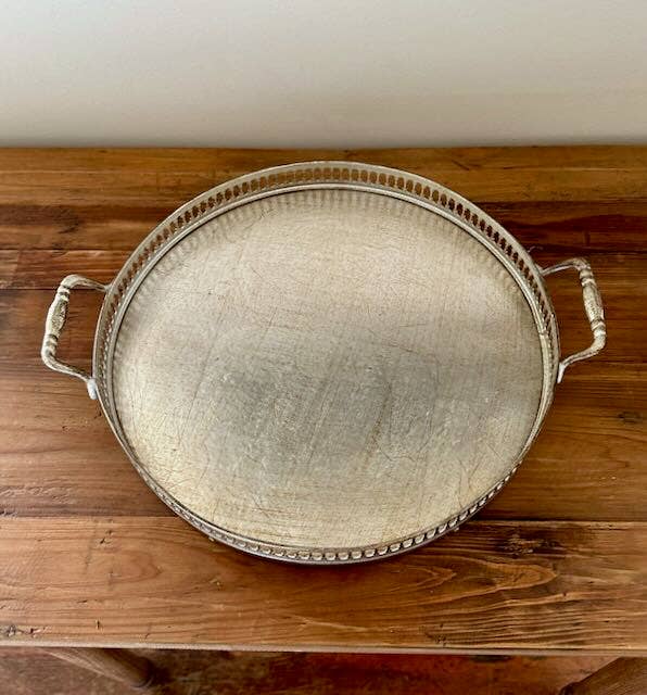 Gorgeous round metal and wood tray, hand-finished in either gold and silver. Use for serving or as a display piece for a stunning addition to any room.