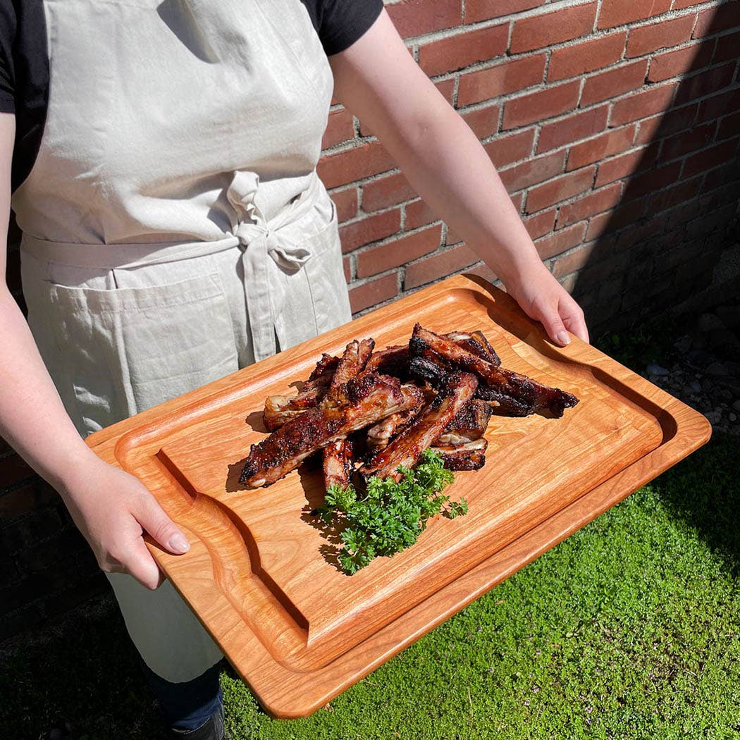 This Cherry BBQ Board features a juice groove around the edges and convenient undercut handles on the backside for effortless transportation to and from the grill or table. With a size of 16" x 12", it also makes for a thoughtful gift for weddings, birthdays, and housewarmings. It comes with a Lifetime Warranty and is proudly made in the USA.