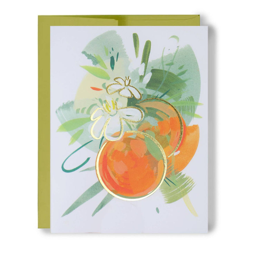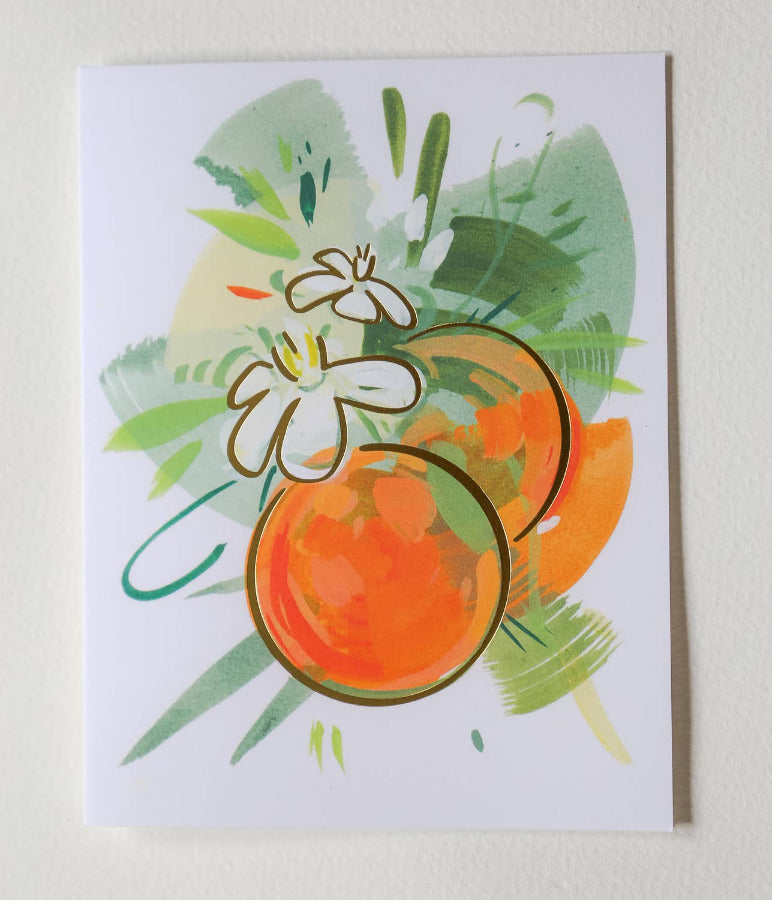 Pair of Oranges | Citrus Gold Foil Greeting Card (Single) This greeting card is a sweetheart… sweet tart! Inspired by the colors and shapes of citrus fruit, these cards are kissed with gold foil to elevate the every day greeting card. The card is blank inside and contains no words on the front, allowing it to be a wonderful carrier of loving words for any occasion.