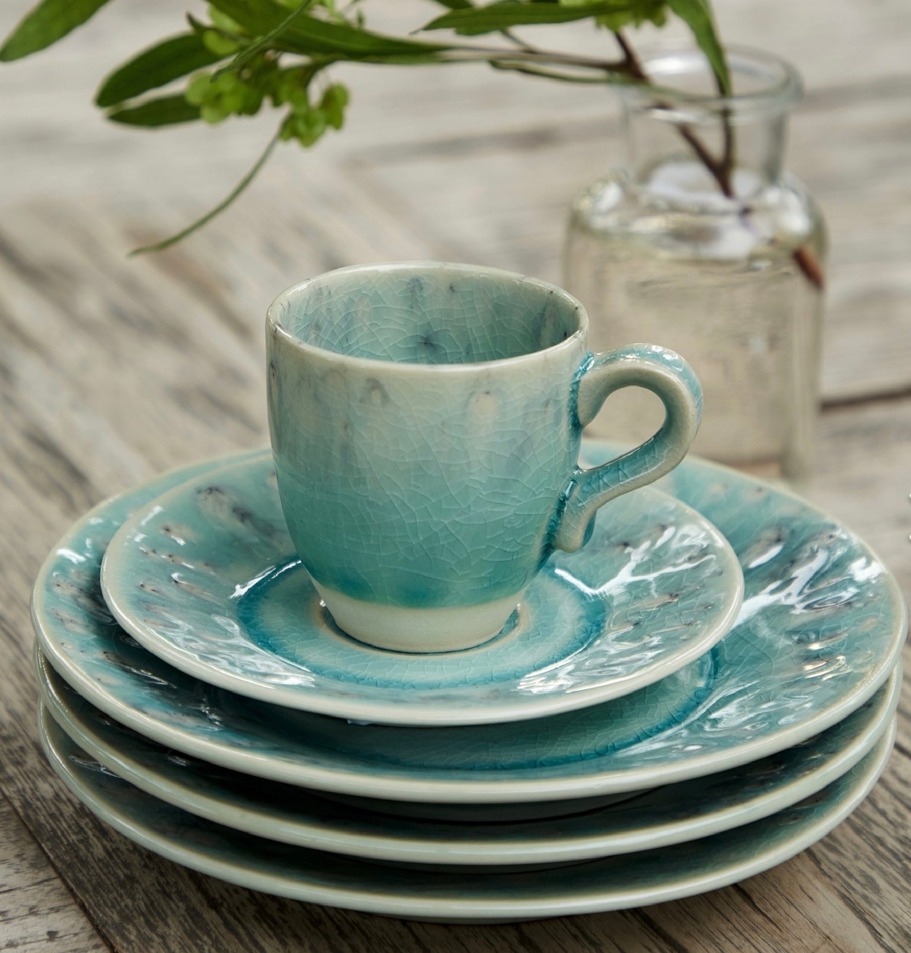 The Coffee Cup and Saucer, handcrafted in Portugal from fine stoneware, features a nature-inspired design with a crackled surface that mimics the effect of dappled lighting. Its vibrant color and unique glaze make it a striking addition to any table setting, perfect for both special occasions and everyday use.