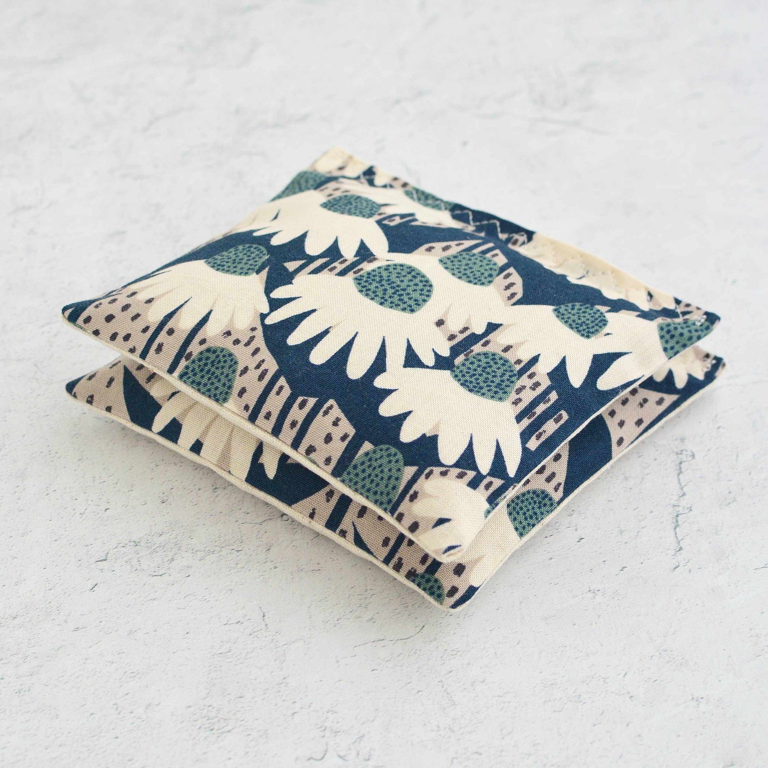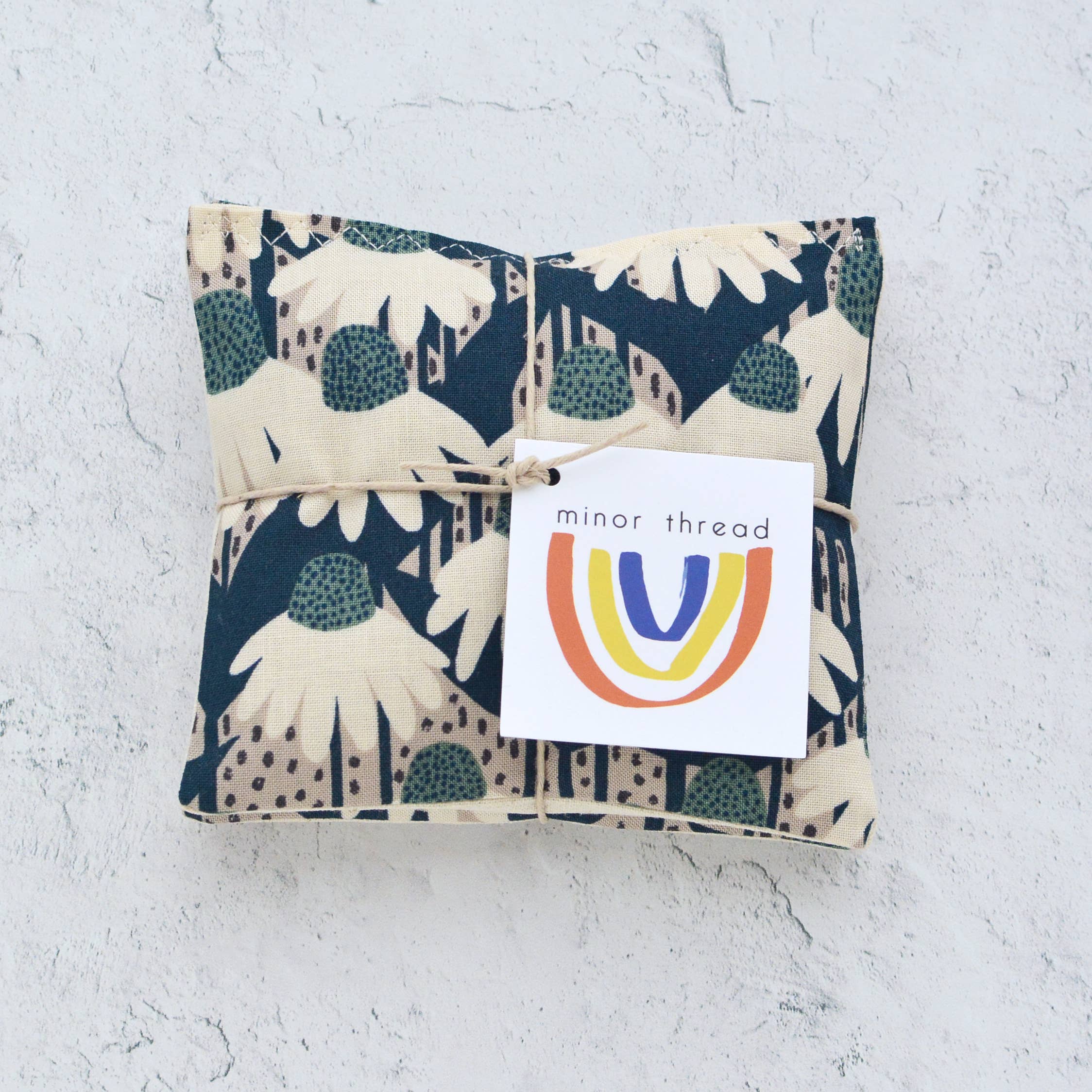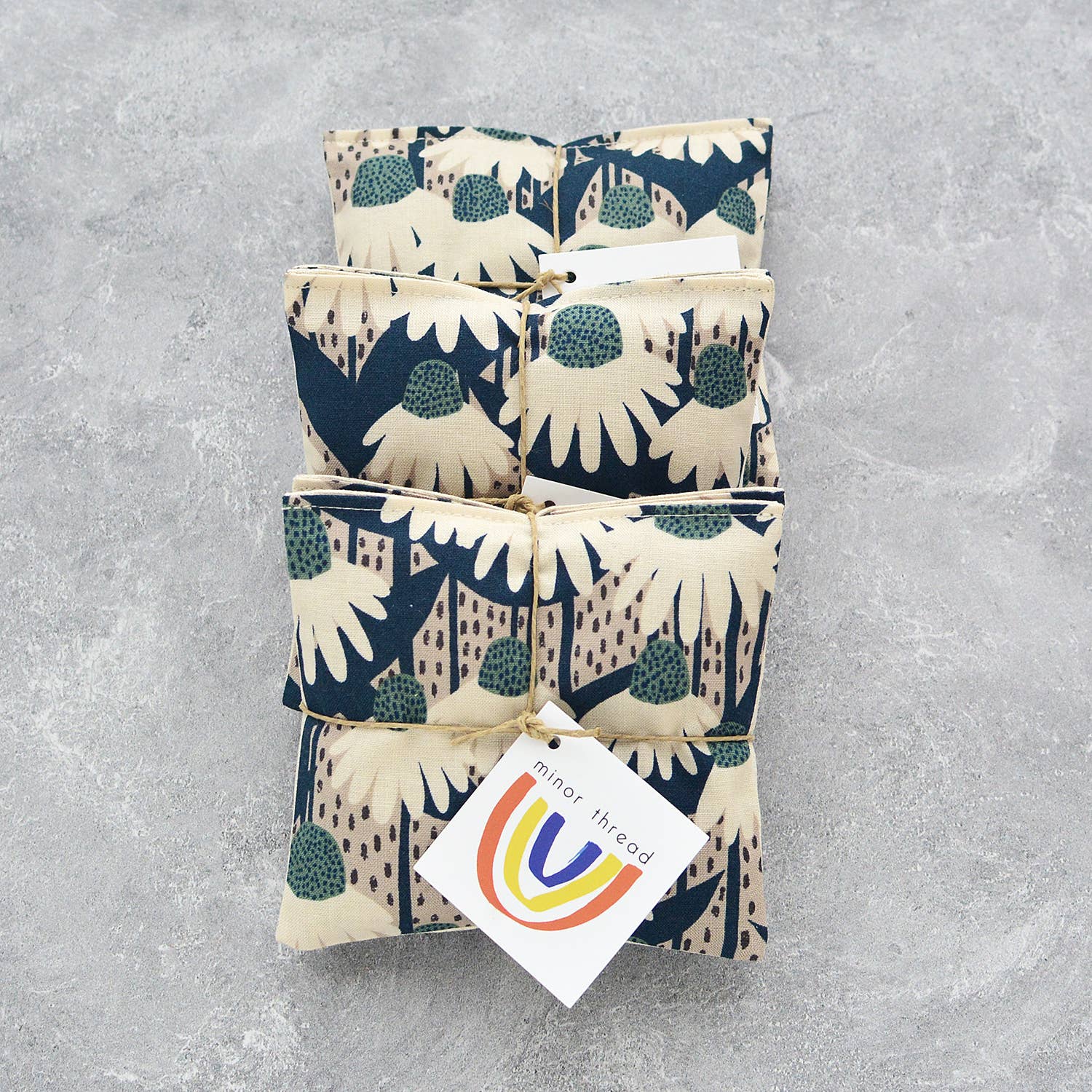 A bundle of two fragrant lavender sachets tied with hemp twine and topped with a hang tag. Each sachet is approximately 4.5" x 4.5", filled with dried lavender flowers. Lavender has a calming and soothing fragrance, and these sachet pillows can be used to freshen up closets, drawers, clothing storage, luggage, yoga bags and more! Keep one in your carry on for a dose of calm while flying, or tuck one under your pillow for extra relaxation at bedtime. These sachets are made with a bold floral print designed by Sarah Golden, featuring a coneflower (echinacea) motif in shades of navy blue, green, black and cream and natural linen fabric. All Minor Thread products are ethically and truly handmade to order in California.