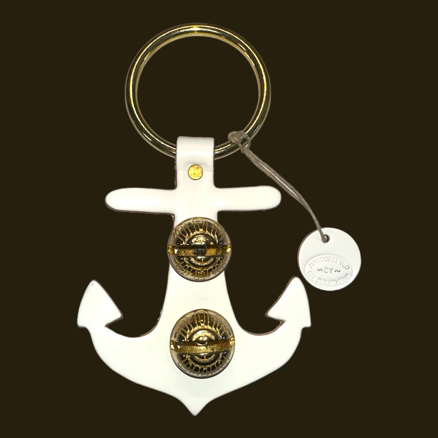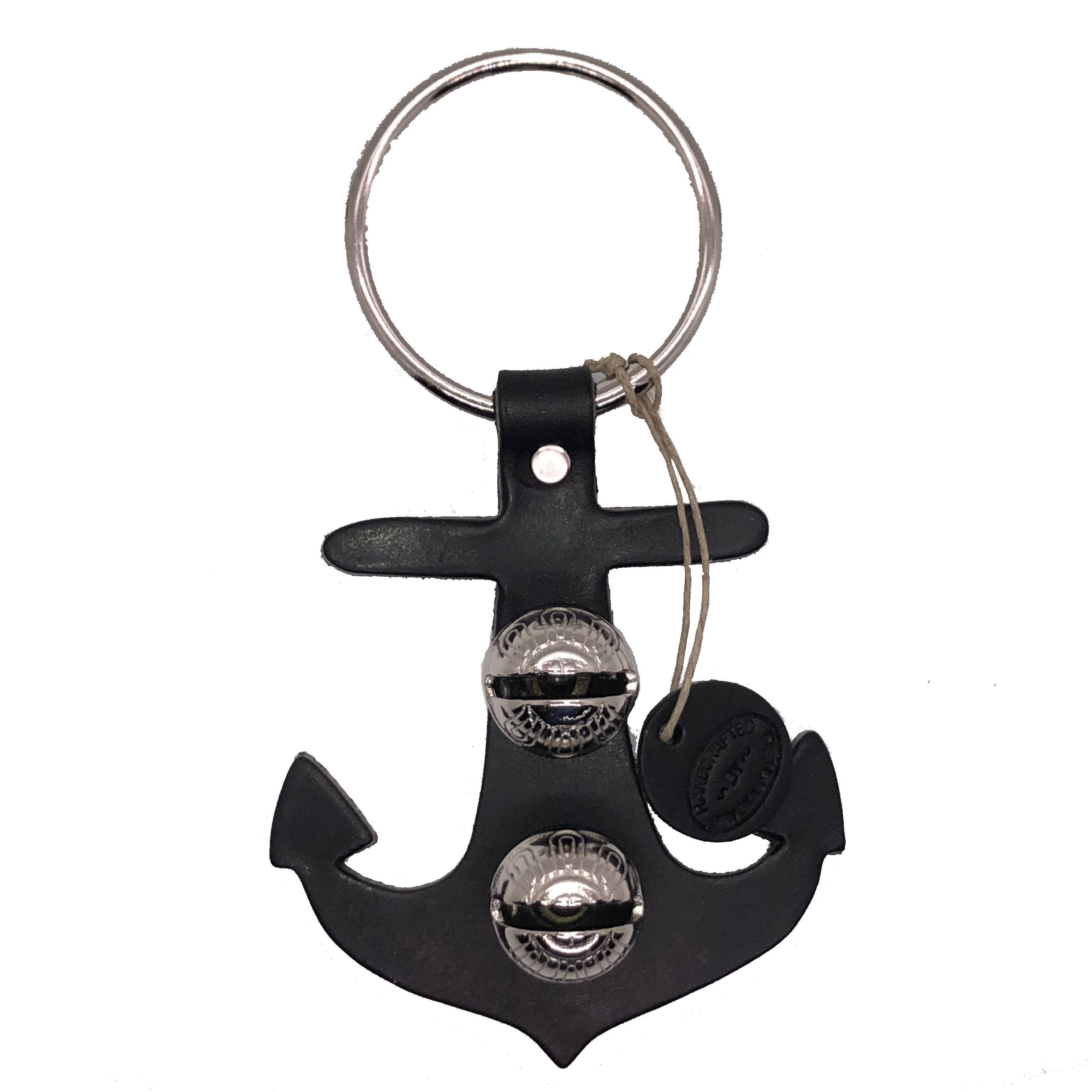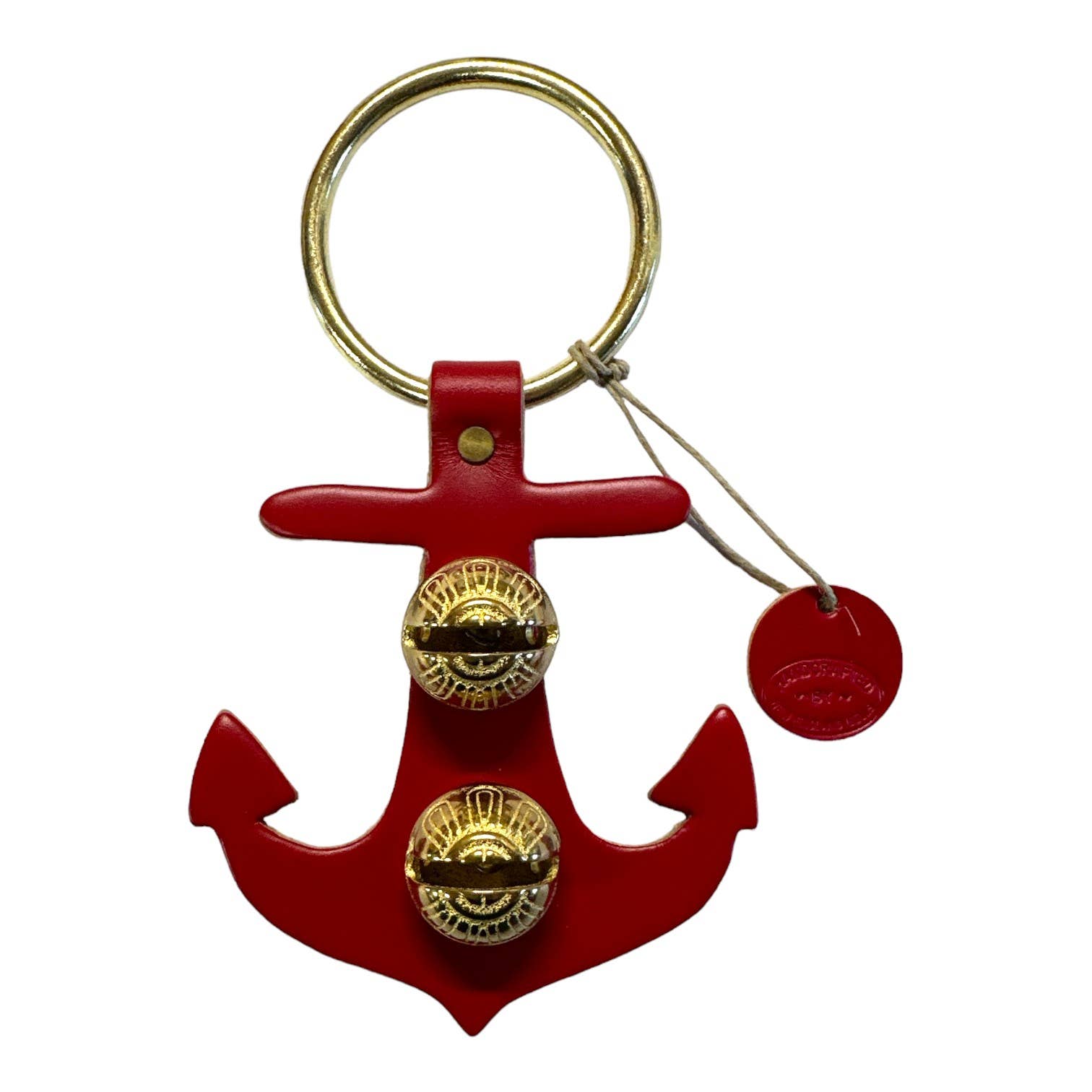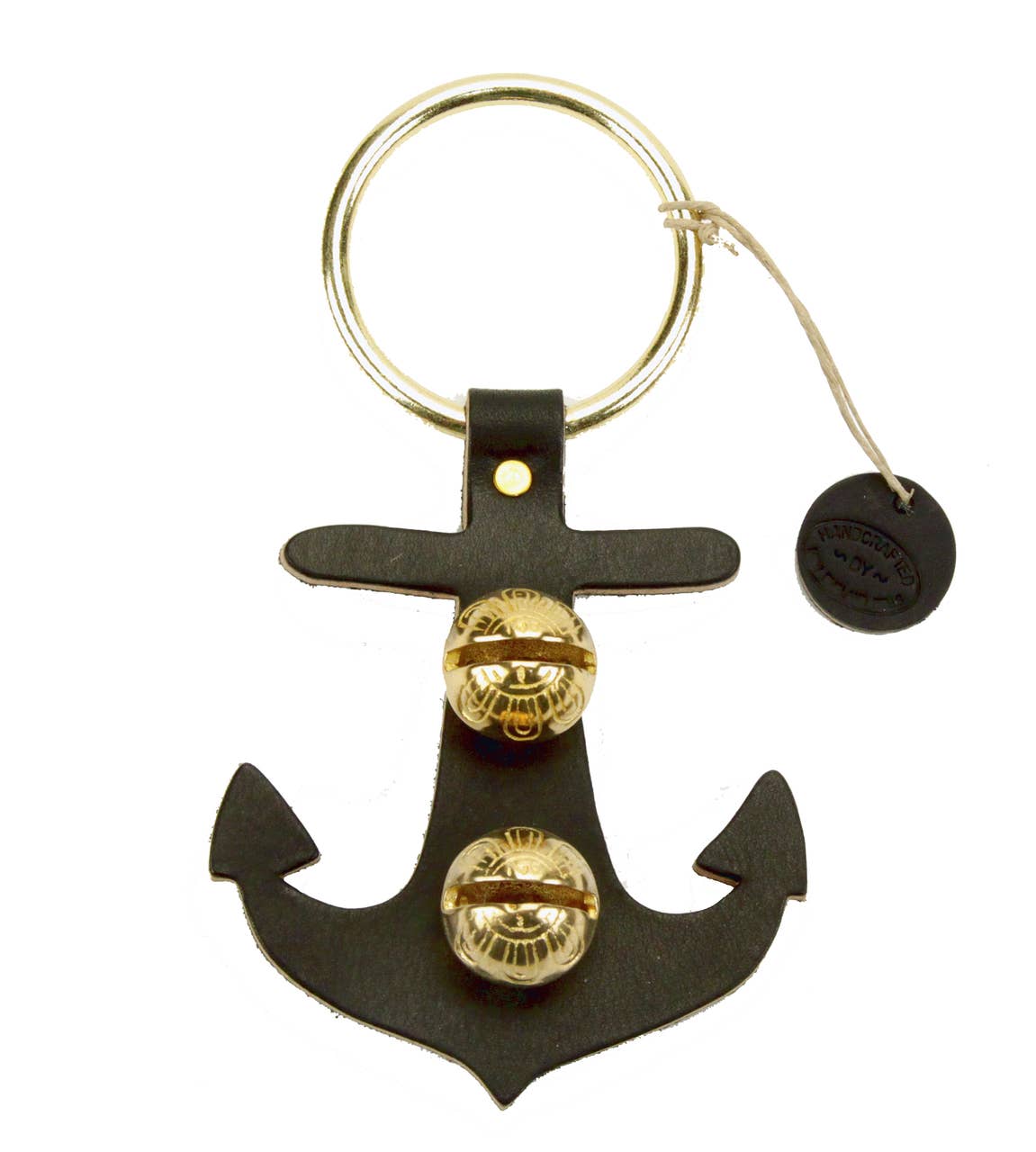 Each of these creations is stamped out of authentic leather. We then use an old-fashioned, foot-powered, riveter to attach the 2 1/2” ring. After the ring is attached, we add two of the popular #1 bells, with easy-to-remove, patented design pins, for quick cleansing. Each product has a hand-punched and stamped leather tag affixed to the ring. Average size: 7” x 6”.
