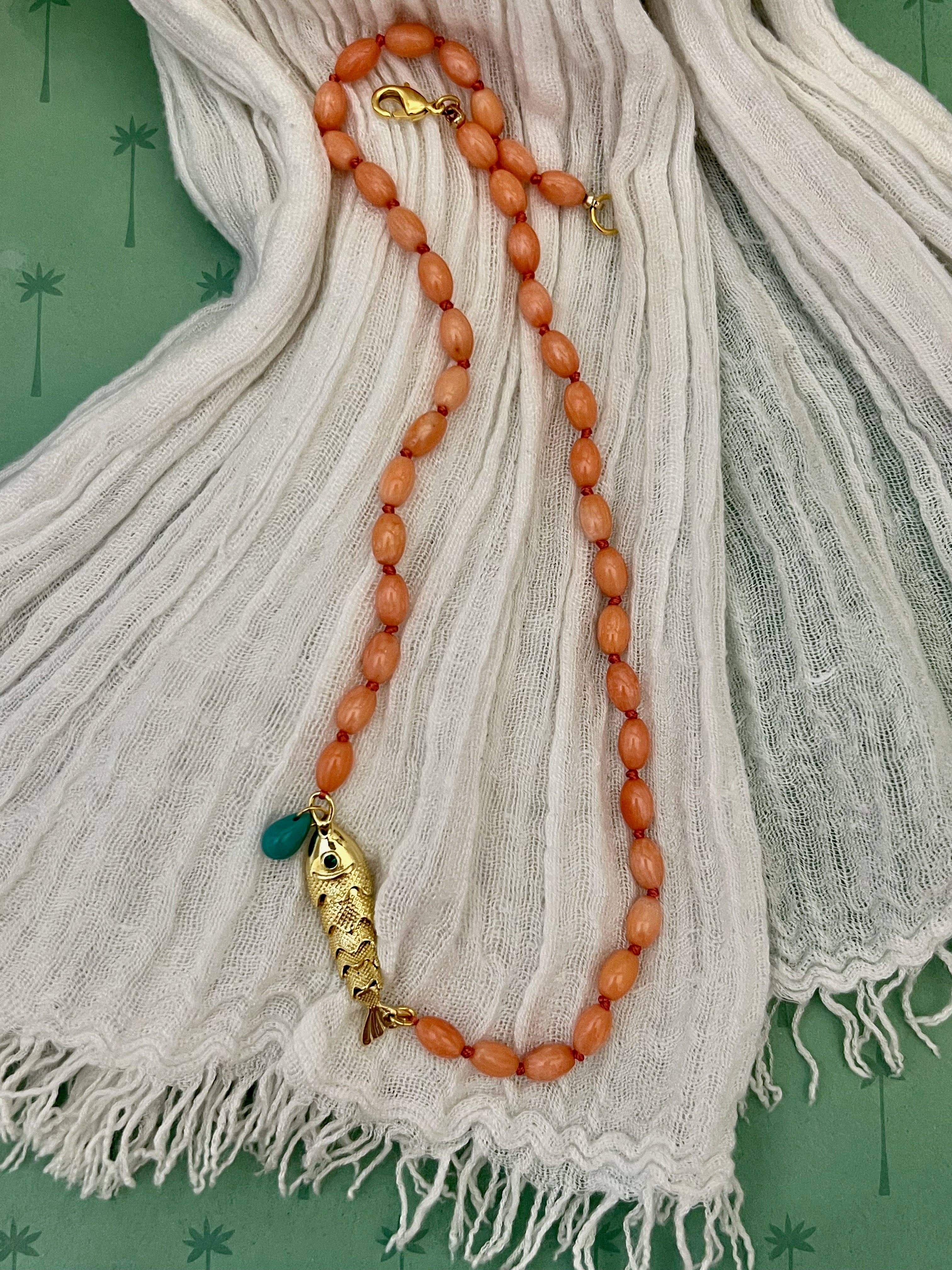 This hand-knotted Bamboo Coral necklace, crafted on silk in NYC, features a distinctive articulated fish accent on the side.