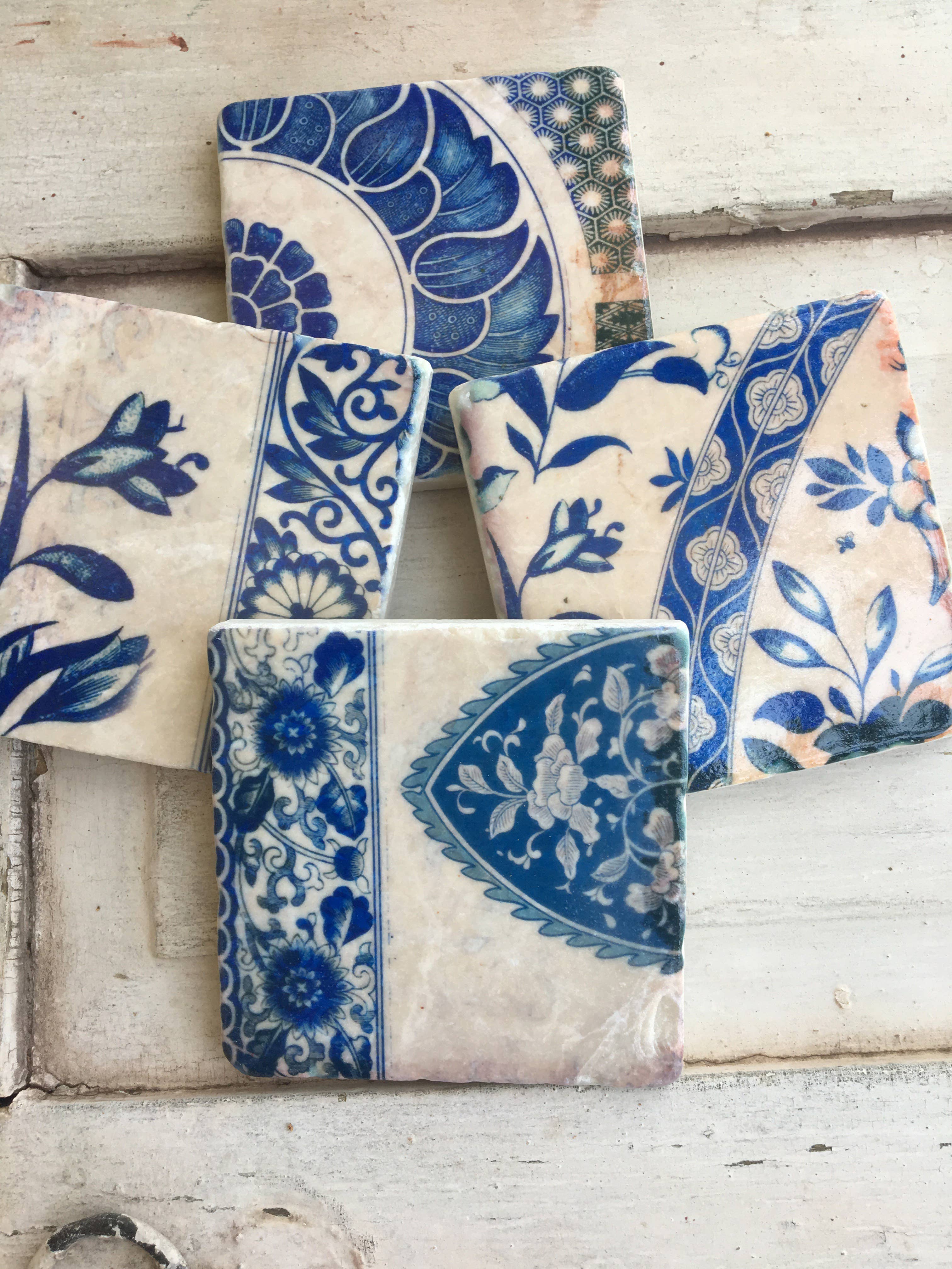 The In Blue stone coasters are made using tumbled marble tile and antique delft tile images. Made to last a lifetime, these coasters are incredibly durable and good for use with hot and cold beverages.