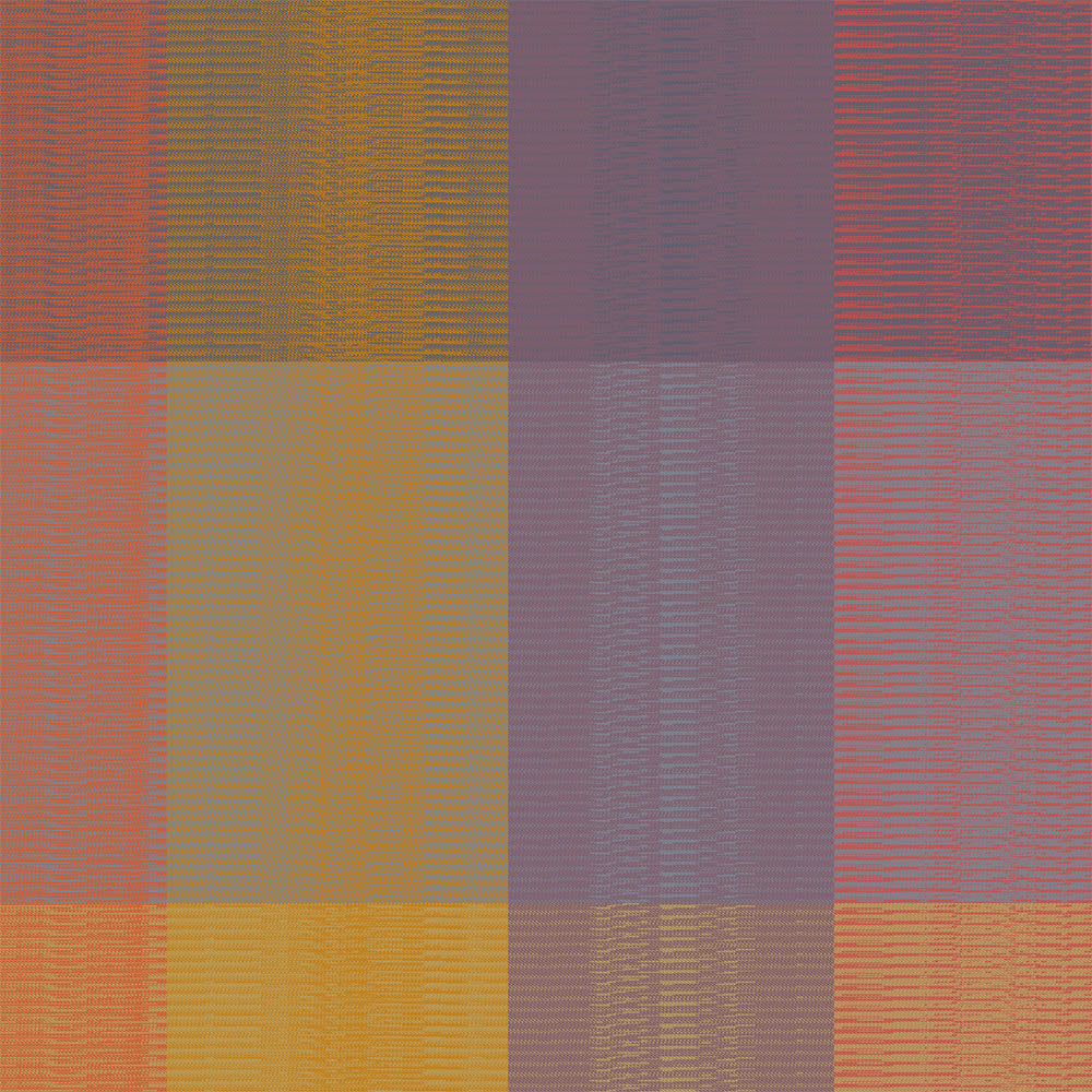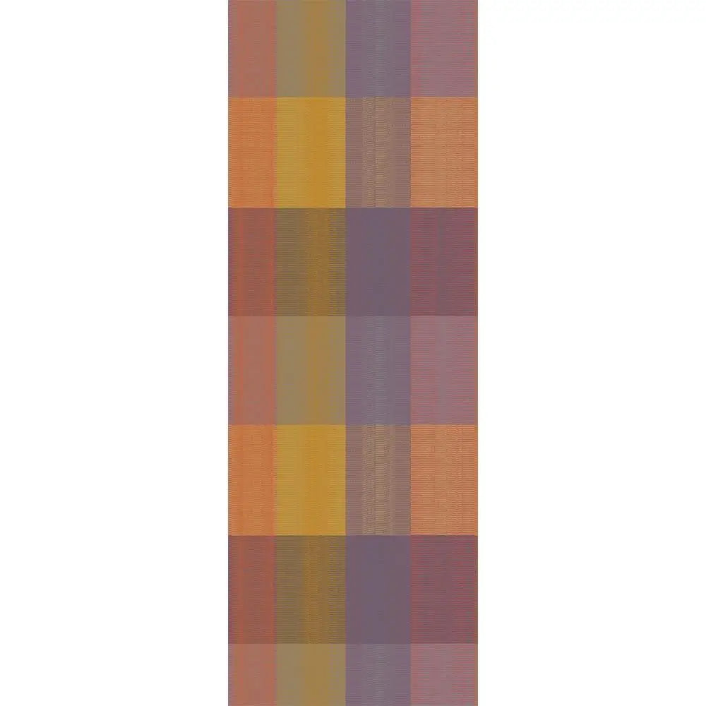 French table linens and aprons feature warm hues of amber, orange, and plum. Their vertical stripes form a contemporary pattern where colors merge smoothly, offering a refined and modern aesthetic.