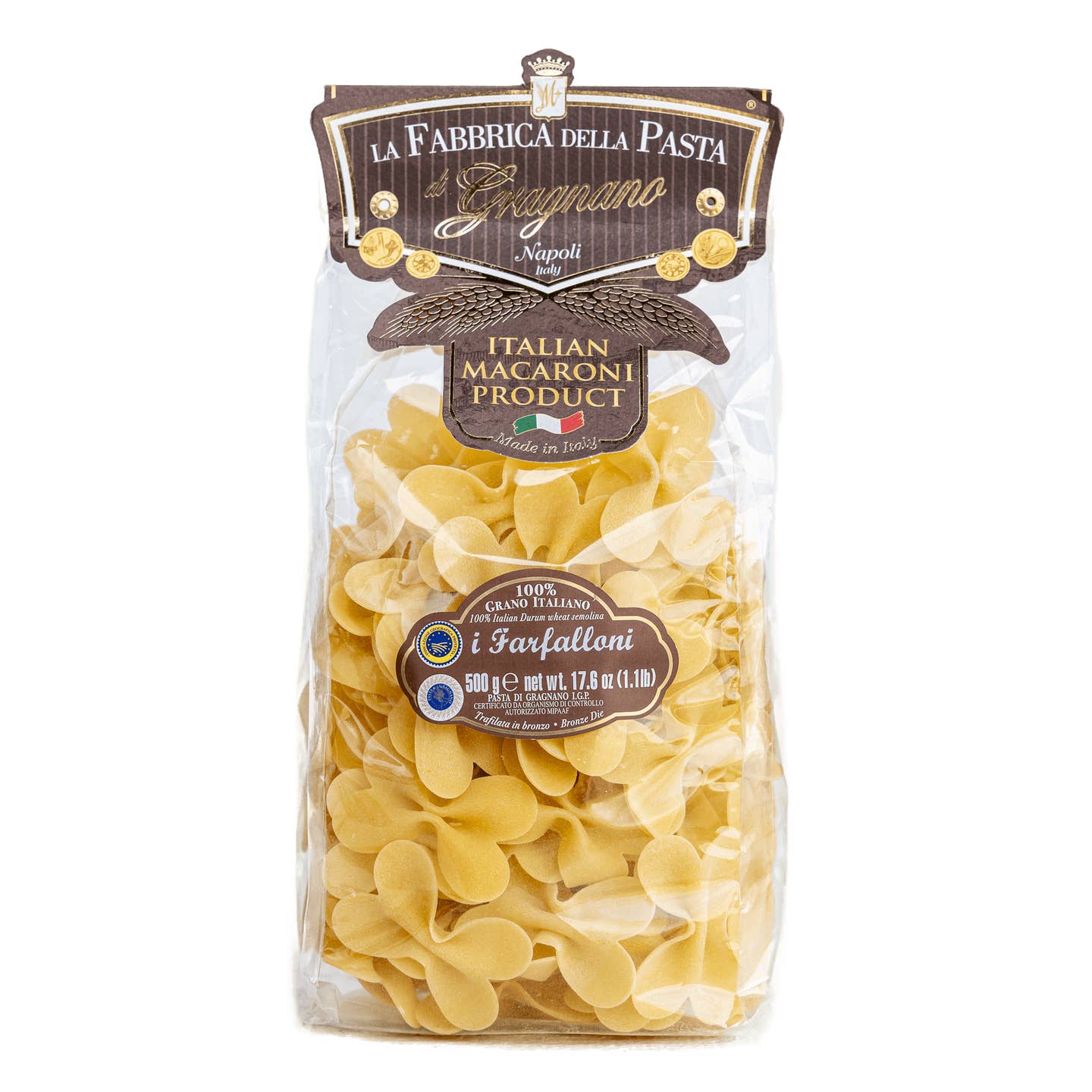 This beautiful and delicious jumbo butterfly pasta is highly versatile. Serve with your favorite sauce. La Fabbrica della Pasta has been making pasta for three generations in Gragnano, a small town nestled in the hills near Naples, famous for its pasta production for over 500 years. Pasta from Gragnano is very special: made with local spring water and high-protein Durum wheat which helps keep the pasta al dente, then extruded through a bronze die, giving the pasta a porous texture that helps it bind with sauce, and dried slowly at a low temperature. La Fabbrica della Pasta is amongst 12 remaining pasta makers in the region (down from the original 300), and became the very first pasta factory in the world to obtain IGP (Protected Geographical Origin) certification for its pasta. They were also the first pasta factory in Gragnano to make a bronze extruded artisanal gluten free pasta. Net weight: 500 g/ 1.1 lb