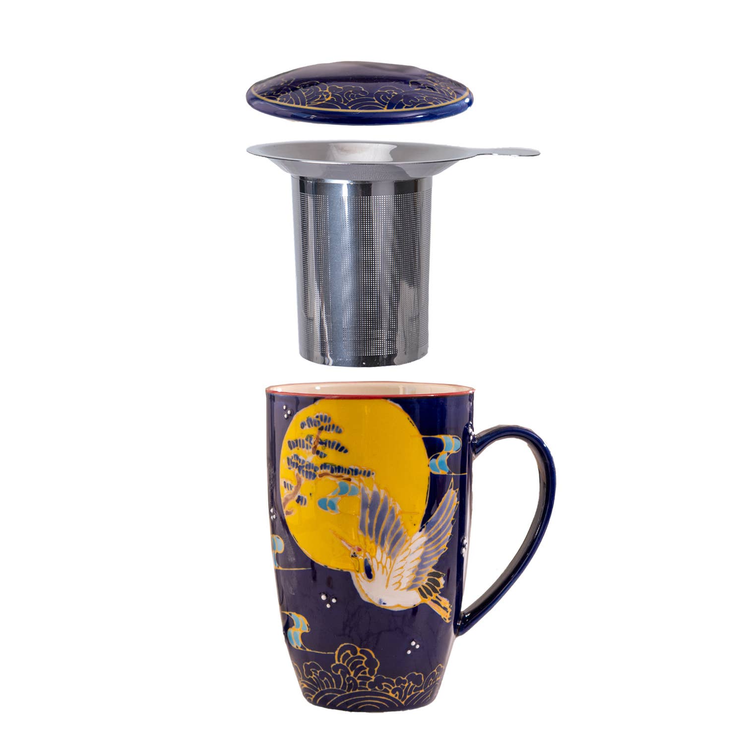 Dimensions: 3.75"W x 5"H. Made of porcelain for the mug and lid, includes a stainless steel infuser.