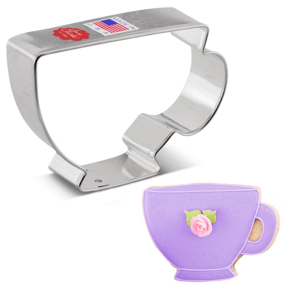 Teacup Cookie Cutter 3 1/2" x 2 1/2". As a top cookie cutter manufacturer in America, at Ann Clark we have extensive knowledge of cookie cutters and the bakers who utilize them. Our cookie cutters are crafted from high-quality USA steel, ensuring superior stiffness and precise edges for cutting through cookie dough and soft foods, and long-lasting durability for future generations to enjoy.