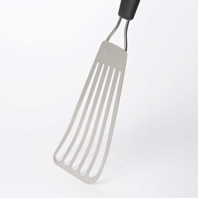 Use this handy Fish Turner when cooking whole fish, filets, seafood cakes and more. The beveled edge slides easily beneath foods and the slots in the head allow grease to drain.