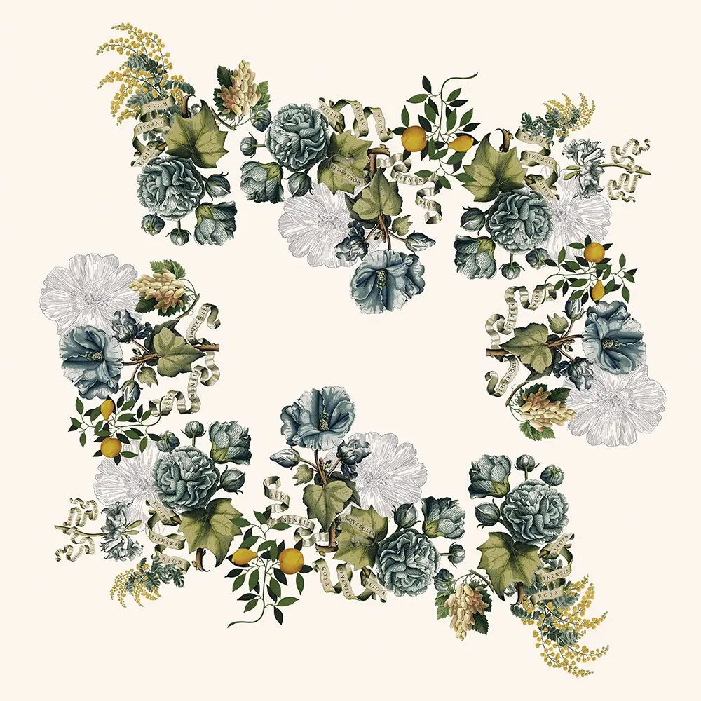 Enhance your table settings for any season with the Giardino Collection. Immerse yourself in the rustic charm of an Italian garden while dining both indoors and outdoors. The collection showcases a picturesque garden scene of blue florals, green ivy, and lemon tree branches on a luxurious cotton-linen blend fabric.
