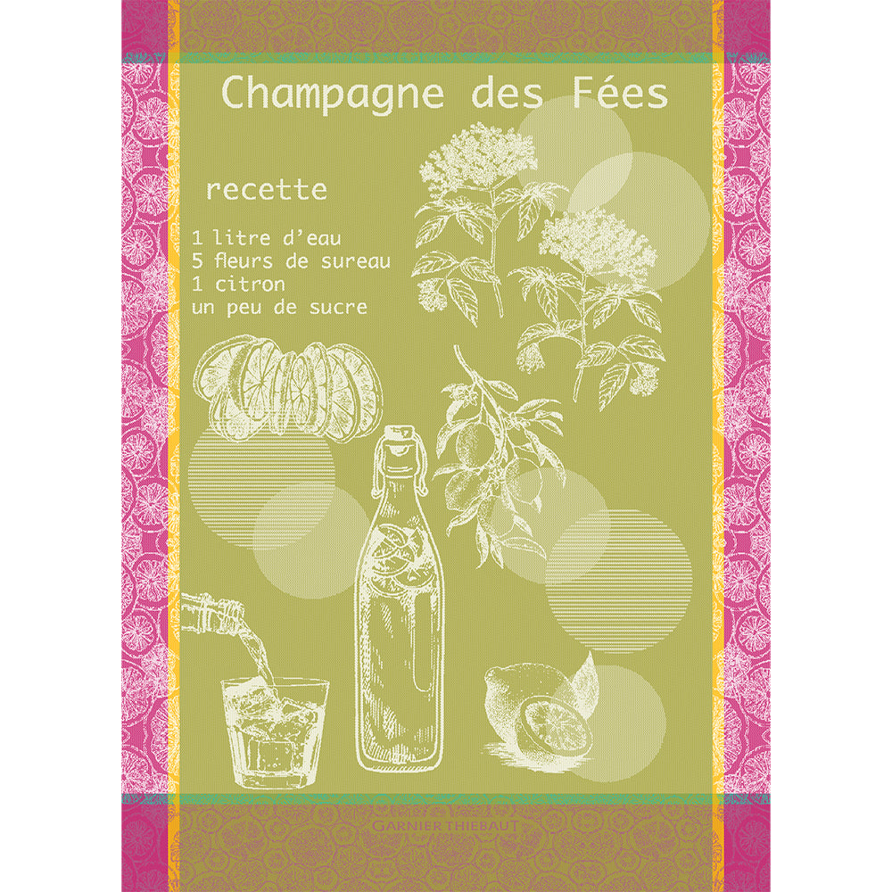 This kitchen towel showcases the recipe for "Champagne Des Fees", incorporating vibrant greens and pinks for a playful touch.