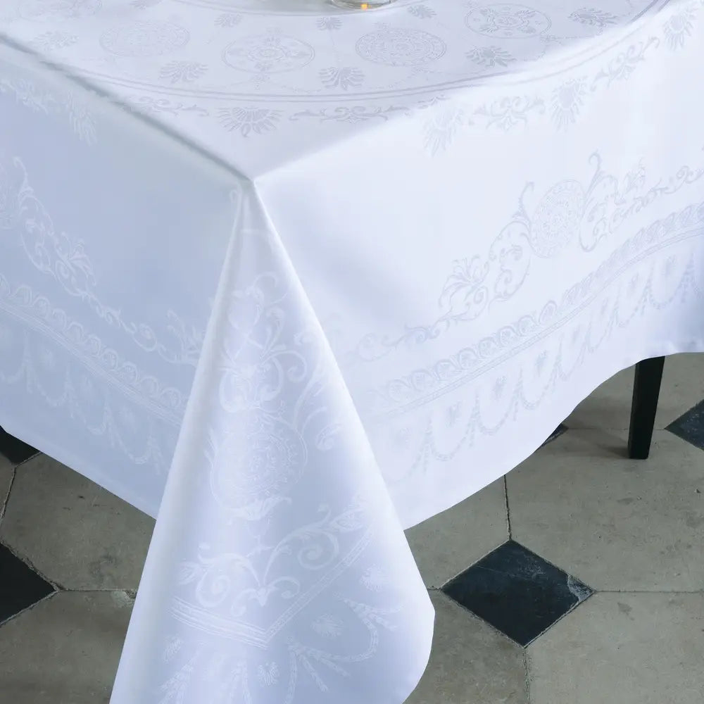 Crafted with refined elegance, this Jacquard tablecloth showcases the superior quality of French manufacturing. Woven from premium extra-long staple cotton with an elevated thread count, it delivers a lustrous finish and intricate pattern definition. The Green Sweet stain-resistant treatment provides practical protection while maintaining the fabric's sophisticated aesthetic.