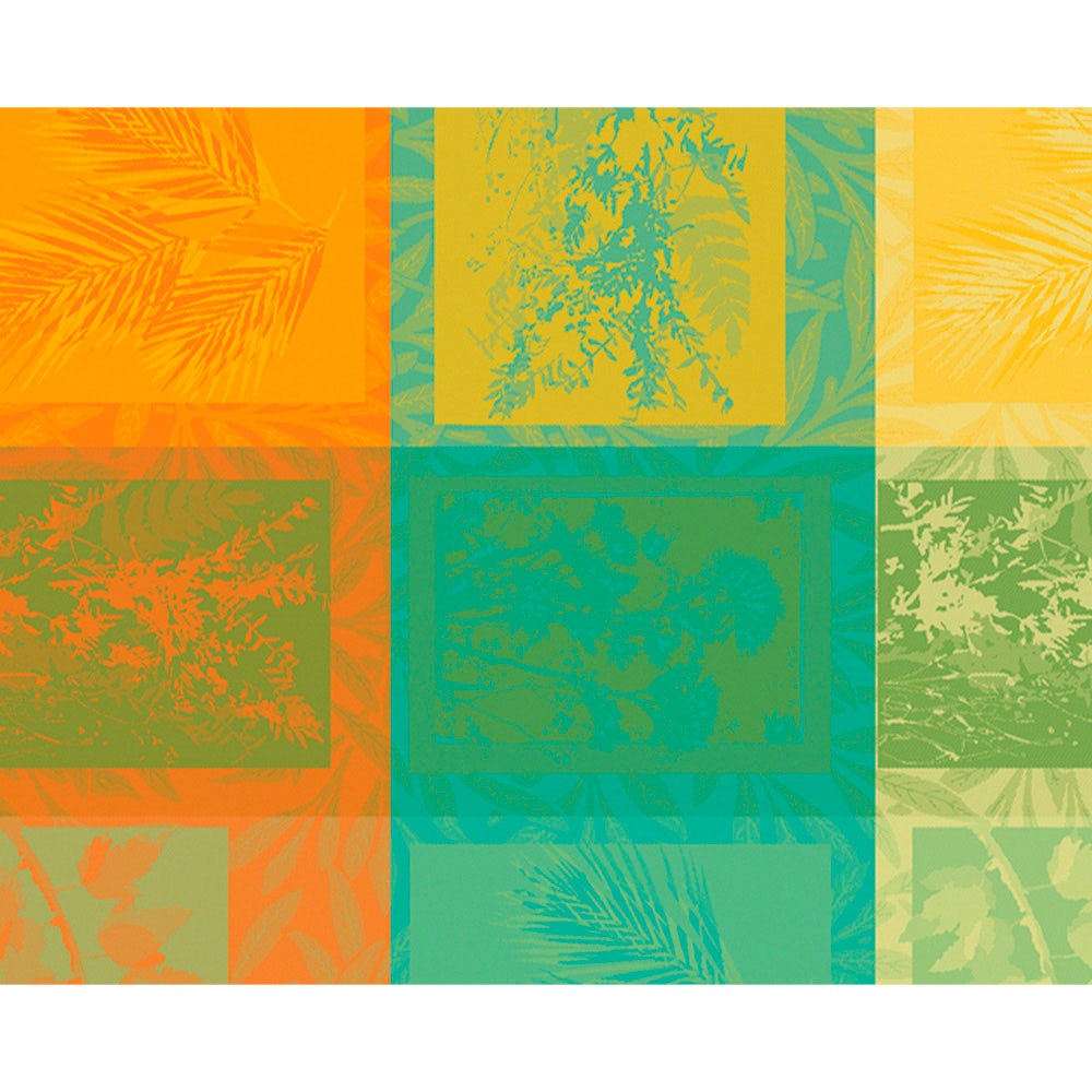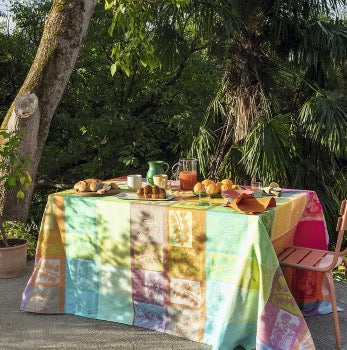 French tablecloth in an explosion of lush colors, living up to its name, Arc in Ciel, or Rainbow. Fucsia, red, green, cyan, purple and yellows come together and create a colorful masterpiece. It feels as a celebration of life, an open invitation to share a meal with friends and family. The vegetation design matches perfectly with its alluring composition.