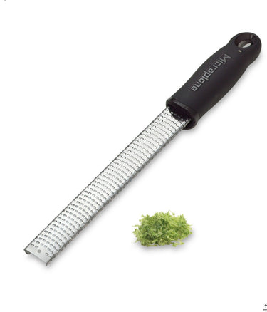 The Microplane Premium Series Zester & Grater Black has moved from the workshop to the kitchen. The iconic long, narrow rasp-style design is made of a surgical grade stainless steel blade with a comfortable soft-touch handle and non-scratch end tabs to grate even the hardest Parmesan Reggiano cheese. Hold the lemon in one hand and the Zester with the side up as if it were the neck of a violin. The zest collects in the upper channel with lacy fine shavings of zest--no more grated knuckles!
