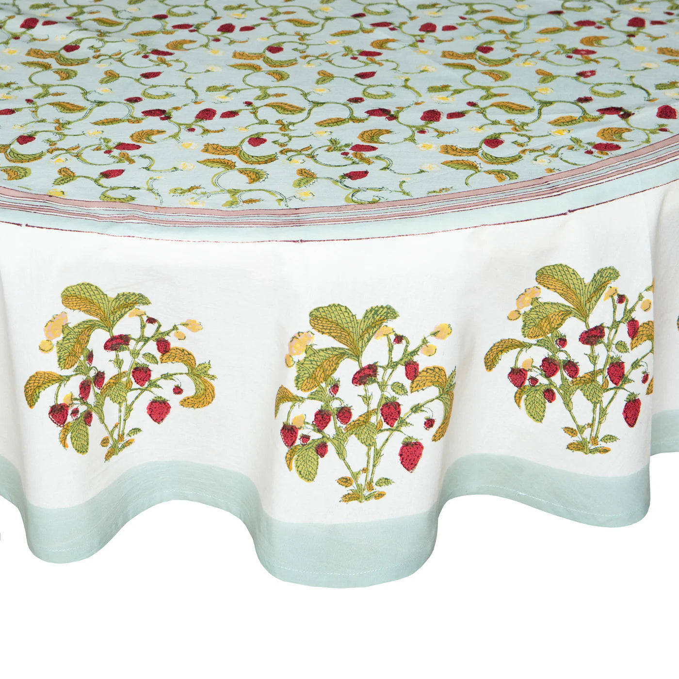 The phrase “wild strawberries” (fraises de bois) evokes a sense of golden summers amid the beauty of the countryside, so it’s appropriate that the Fraises des Bois collection features vibrant colors and botanic designs along with orderly patterns and a calm ivory backdrop. This high-quality tablecloth has been carefully handprinted by skilled artisans using a time-honored technique, resulting in a singular piece of craftsmanship.