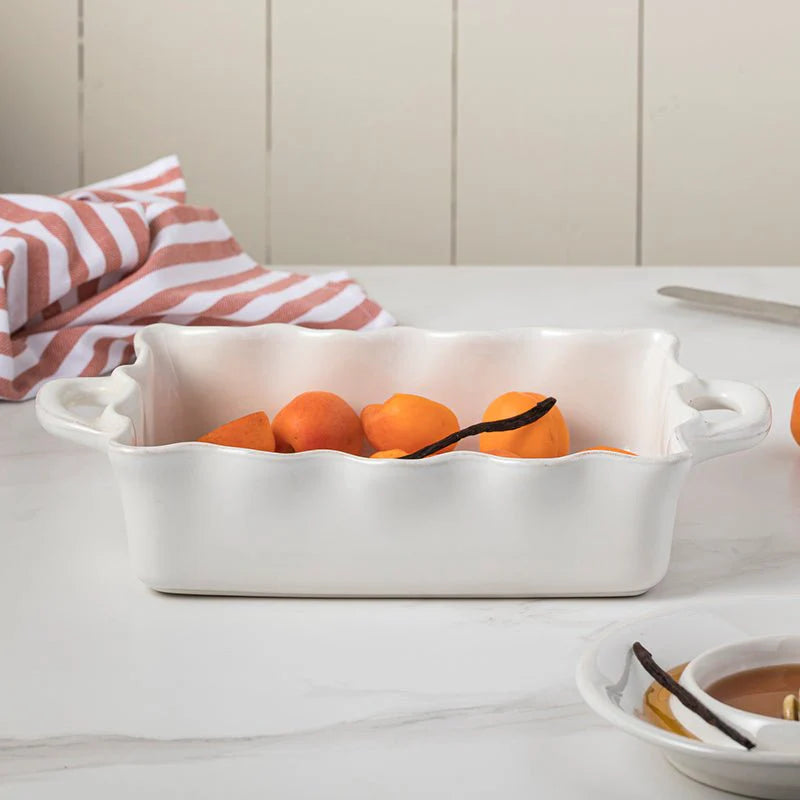 This white ruffled stoneware ceramic baker, made in Portugal, is the perfect addition to any host's collection. It is oven, microwave, freezer, and dishwasher safe, making it a versatile and practical choice. For oversized or delicate pieces, we suggest hand washing as a precaution.