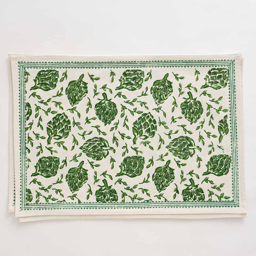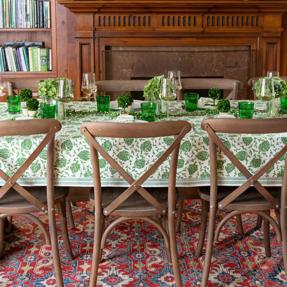 Dancing artichokes across your table. This favorite green and white print work year round, suitable outside on your patio as well as inside your home. Who knew the globe artichoke is actually a perennial thistle? Hand painted globe artichokes are classically reimagined in this refreshing design.