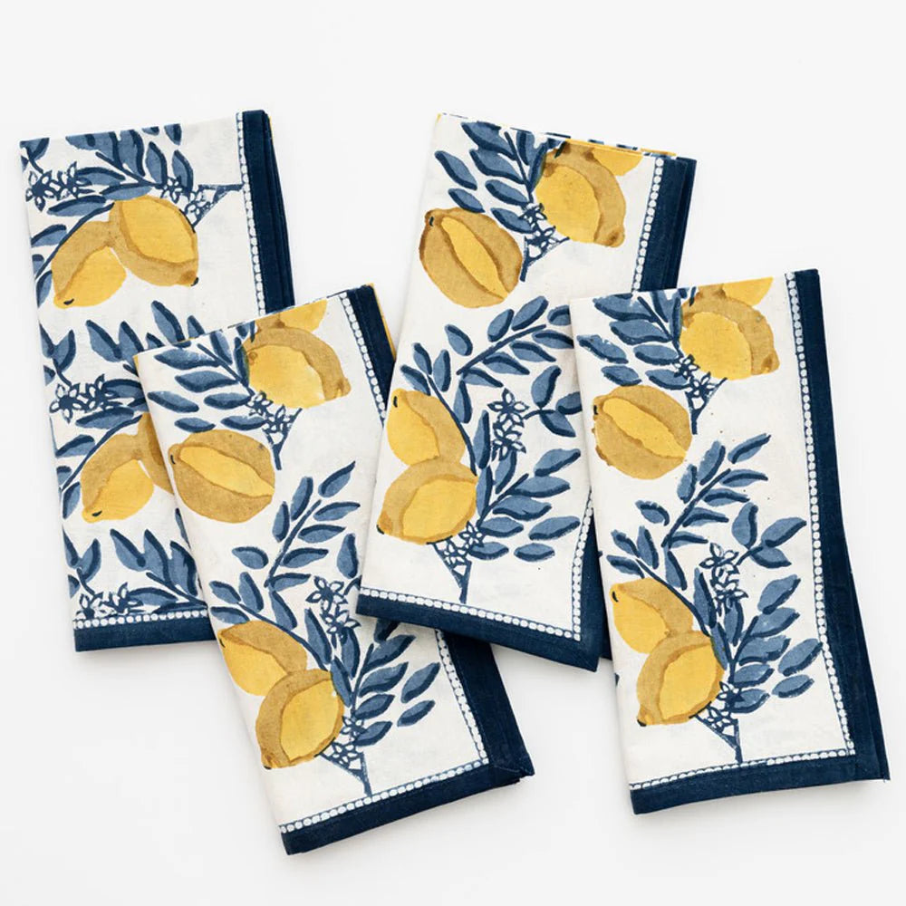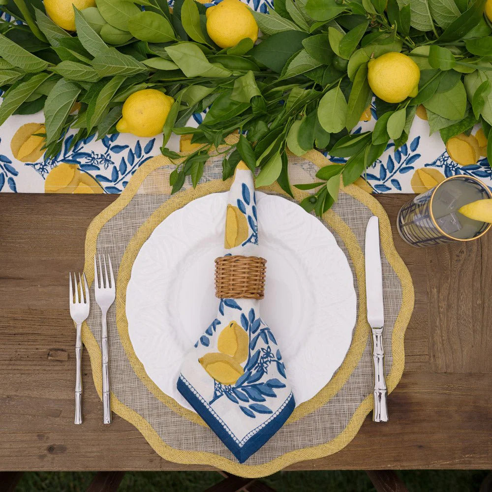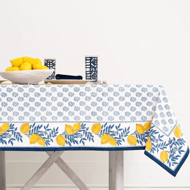 French Country style. The Lemon Grove print looks like it comes from the fields of Provence. Rich yellow hues and Provençal blue tones are reminiscent of traditional French textiles. Classic blue and yellow design, exclusive to Pomegranate, hand painted and hand block printed by skilled artisans. Tablecloths available in assorted sizes to elevate your table in style.