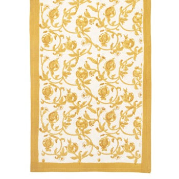 Featuring a delicately intertwined floral pattern with iconic mustard pomegranates atop a white background, the Granada Mustard collection makes a richly colored complement to any table.