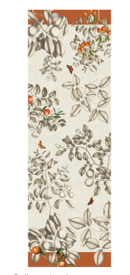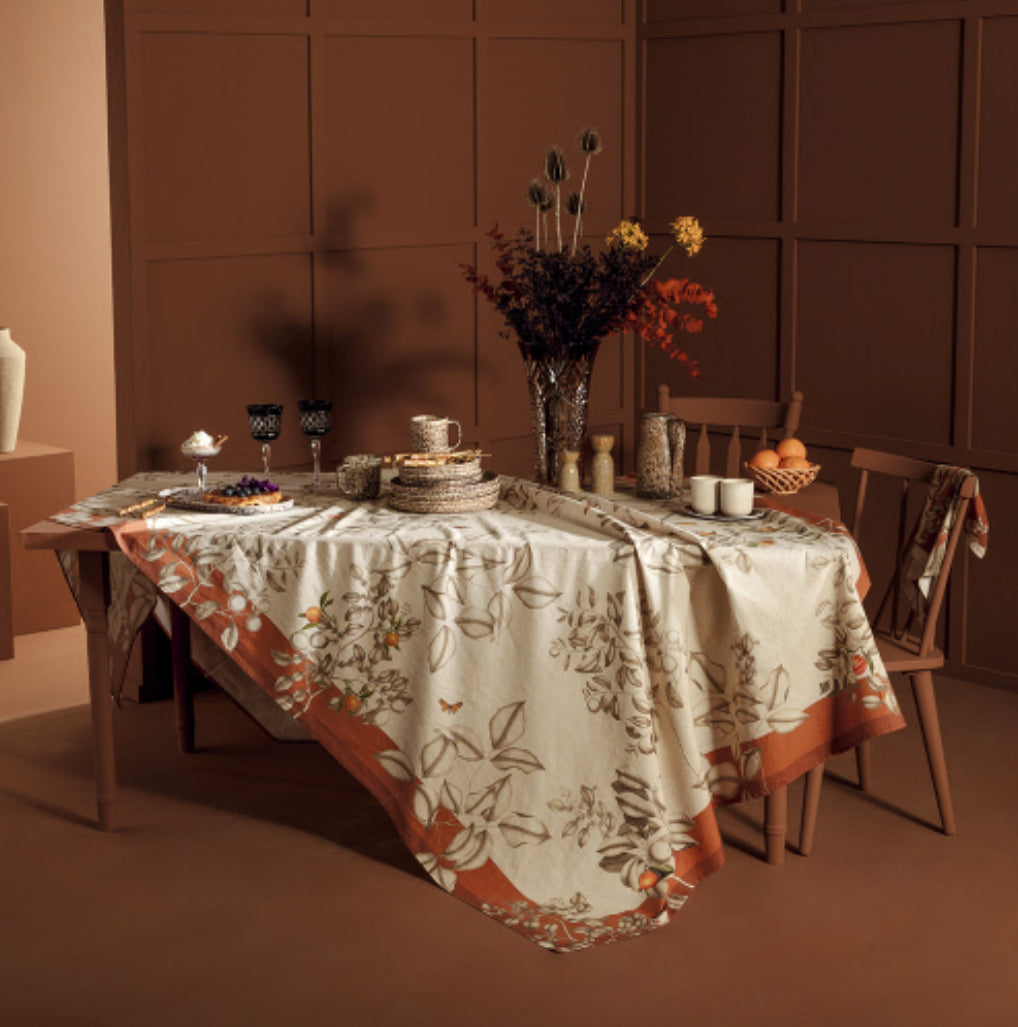 Featuring robust orange mandarins and delicate butterflies against a leafy cream backdrop and bold terracotta border, the Mandarines Rouille Collection evokes effortless elegance in every table setting. This printed design was crafted from original artwork, hand-drawn by our in-house team of textile artisans & designers in France. Combining the best qualities of cotton and linen, this fabric blend seamlessly enhances the table with its effortless appearance while providing durability and long-lasting performance.