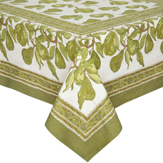With a nod to the lush splendor of Orchard Pear, the Orchard Pear tablecloth features an array of sumptuous fruit amidst richly entwined foliage. The twirling vines and blossoming imagery make a pleasing backdrop to any meal, and this high-quality linen is hand-printed by skilled artisans using a time-honored technique, resulting in a singular piece of craftsmanship.