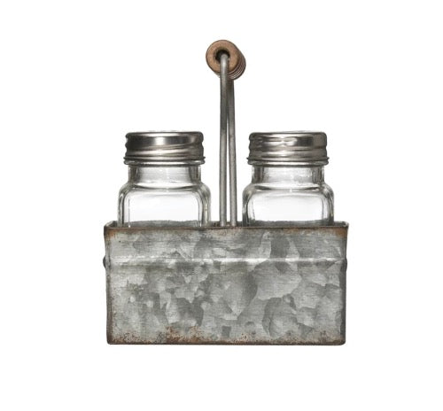 This classic, vintage style salt and pepper set features square glass shakers in a galvanized metal carrier.