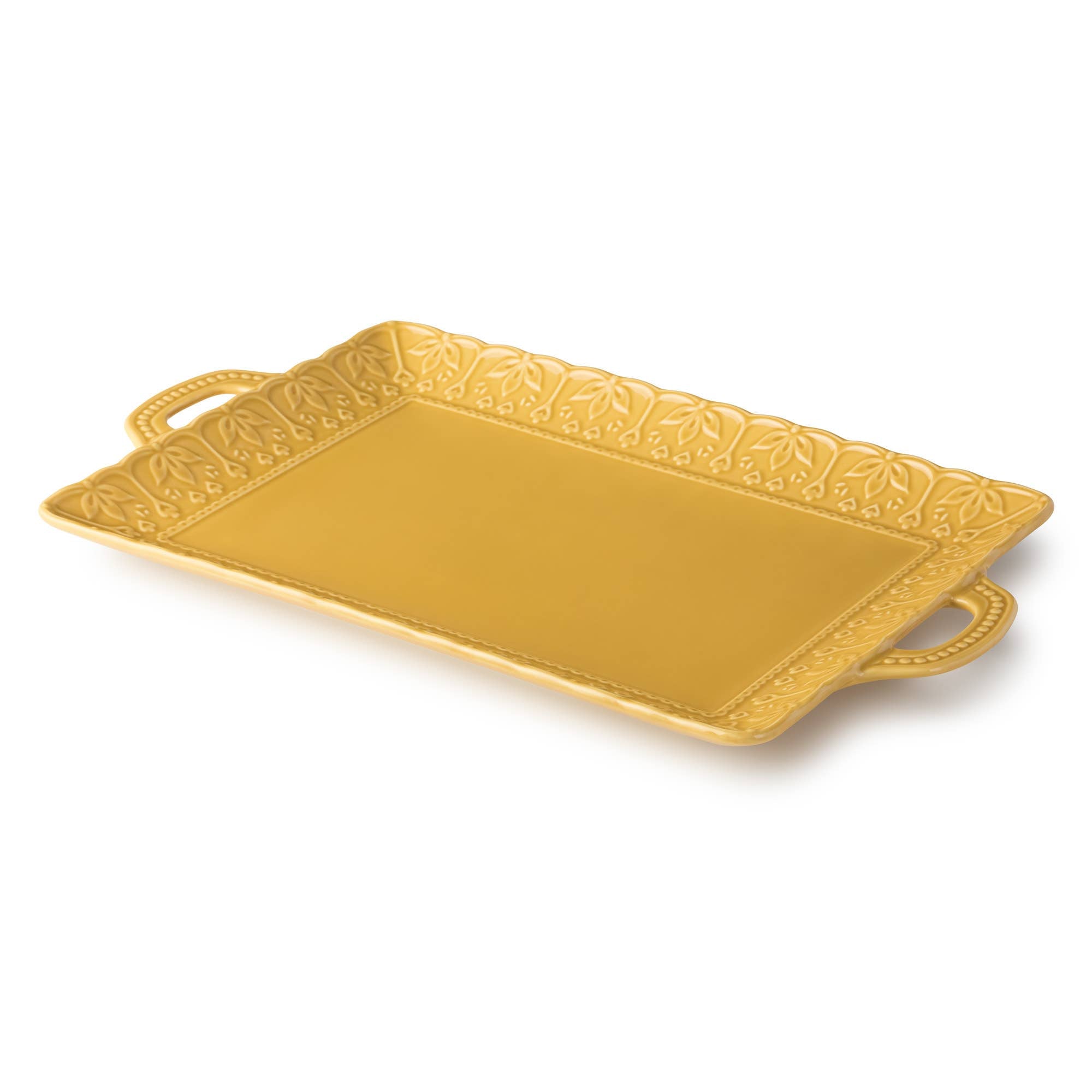 At 17 inches long and 12.5 inches wide, this platter is perfect for showcasing everything from a roast to a rainbow of grilled vegetables or a vibrant charcuterie arrangement. Its embossed floral border and rich golden hue evoke the texture and elegance of hand-thrown pottery, adding timeless beauty to every occasion.