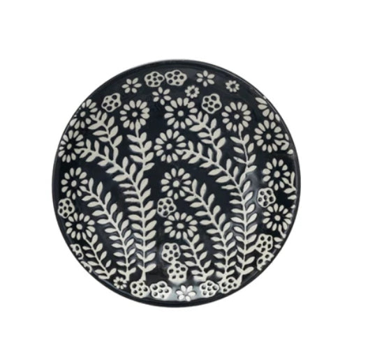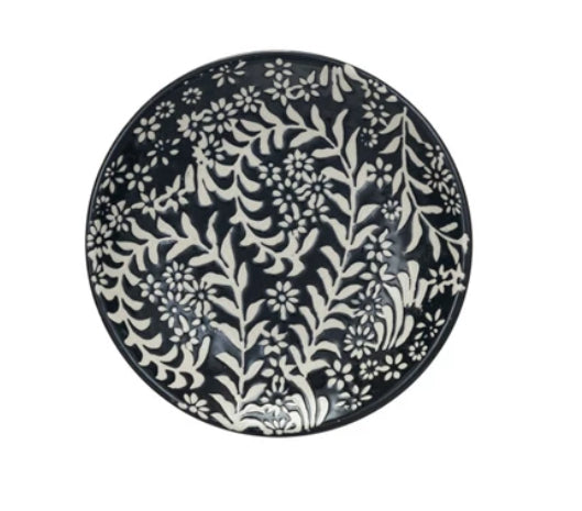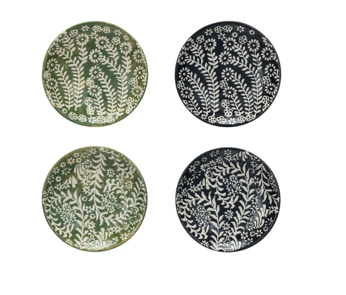 These wax relief plates feature a combination of green and black floral designs; all textural and perfect for a bold neutral on the table.