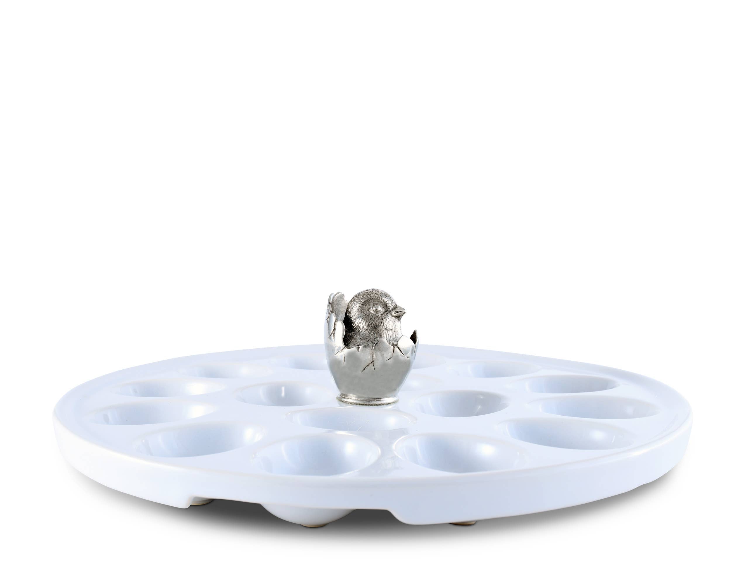 Absolutely adorable, a tiny, detailed pewter hatchling chick greets the world for the very first time as the delightful, 3-D decorative figure on Vagabond House’s Little Chick Deviled Egg Tray. Charming Little Chick, still ensconced in her egg, sits in the middle of a fine stoneware tray designed to perfectly display and serve 16 luscious deviled eggs. The fine stoneware tray is hand-glazed and twice fired creating a deeply luminous white finish. Cool pewter and calm white stoneware blend perfectly with any table theme or mixed buffet. Spring and Easter favorites, the tray serves up 16 deviled eggs in seasonal style.