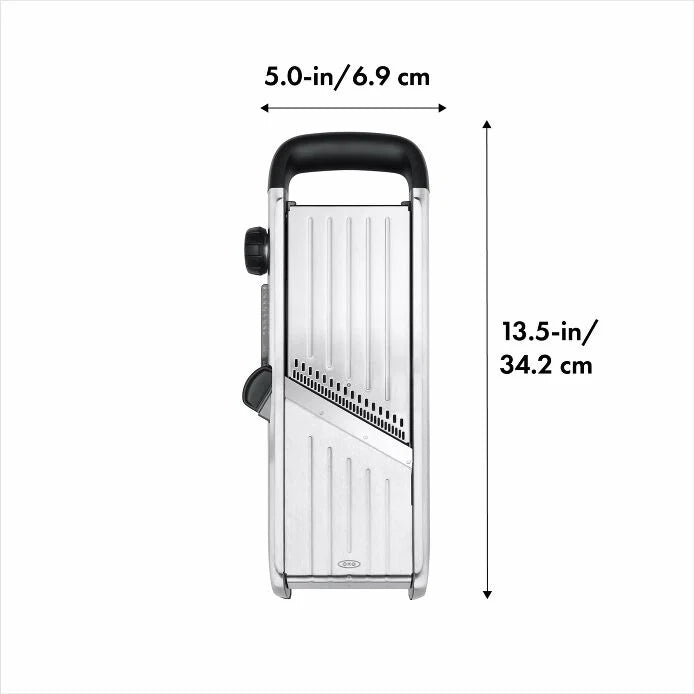 The OXO Chef's Steel Mandoline Slicer 2.0 is the perfect combination of our original Mandoline Slicer with updated features for maximum ease of use, such as an angled Japanese steel blade and a top-view indicator window for quick blade setting changes.
