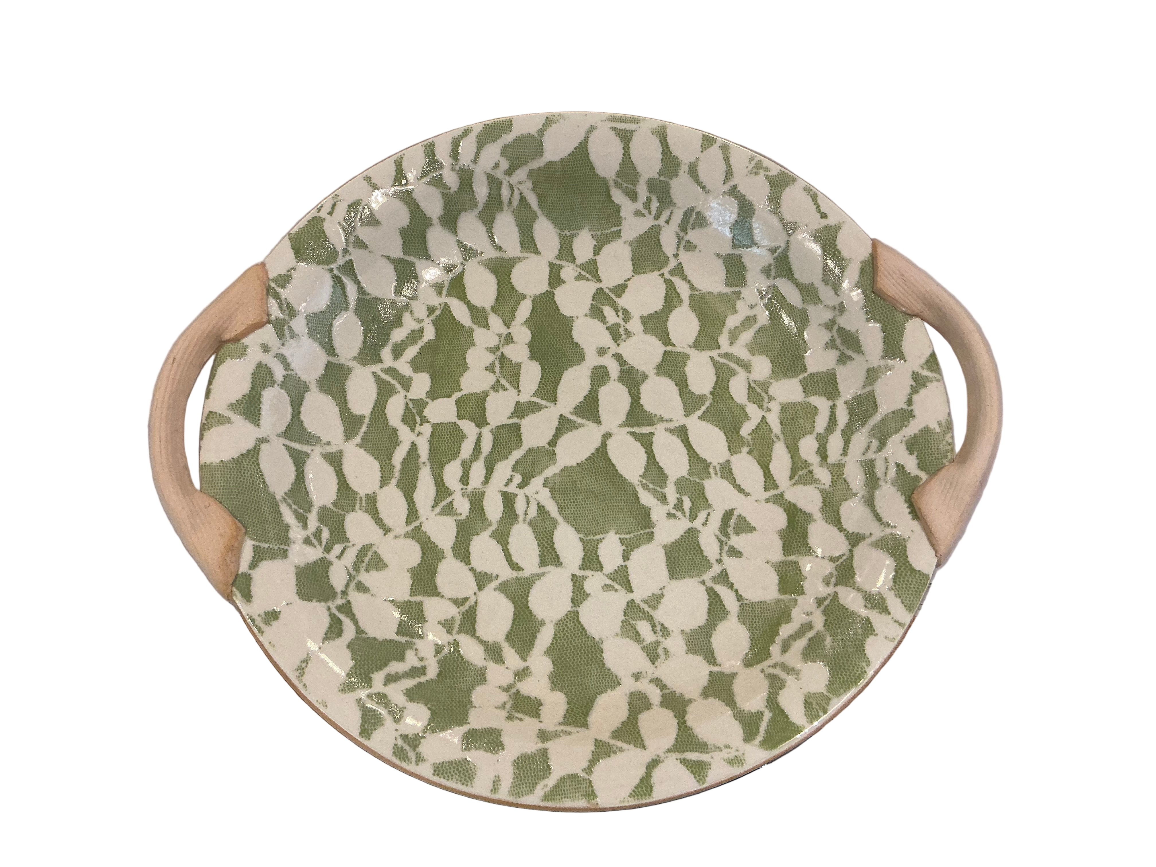 13” Round Platter with natural ceramic handles. Features Aspen inlay design in citrus green.
