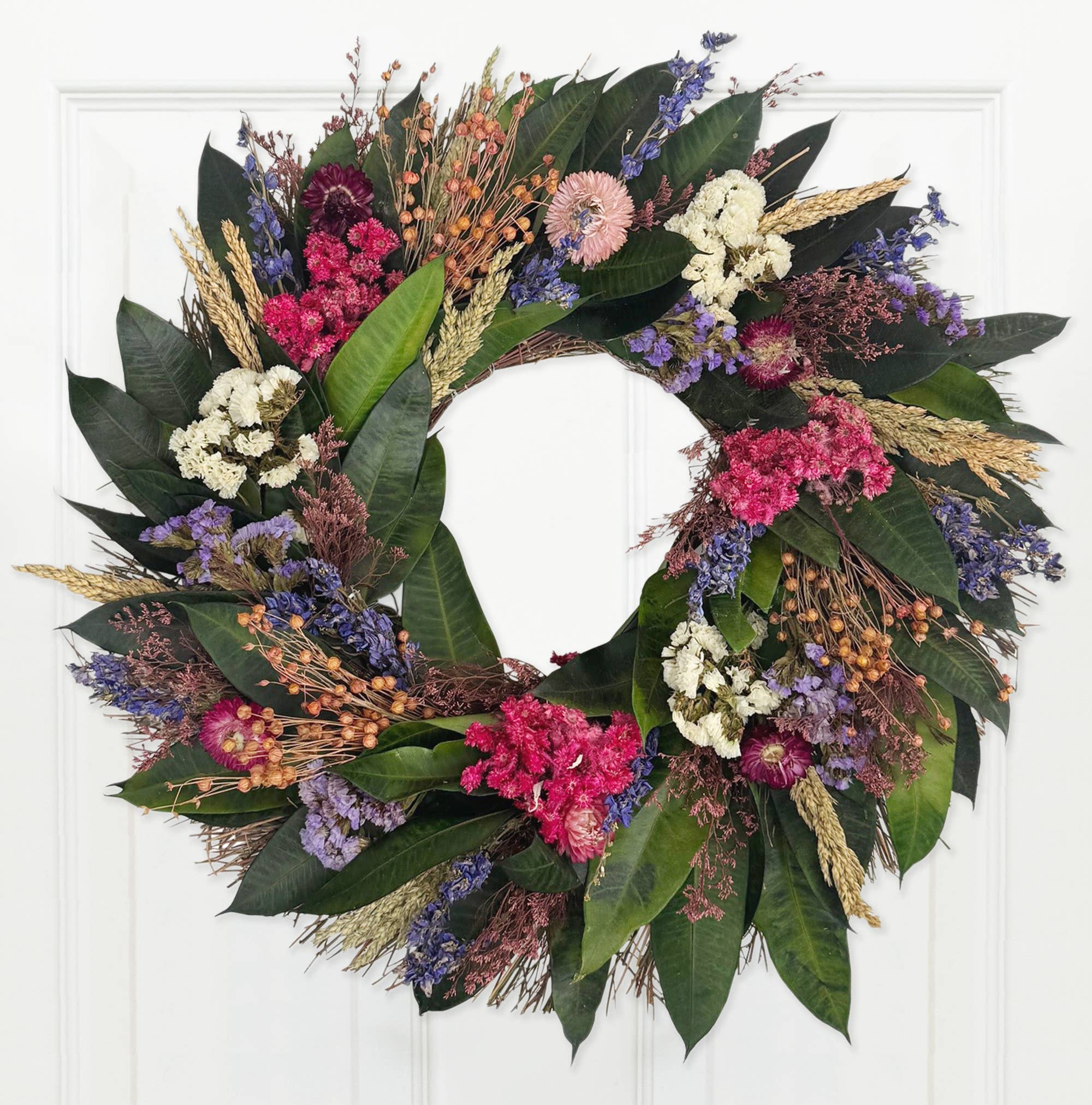 Using multiple types of delicate dried flowers and lush green leaves, we made this delightful Newport Wreath that fits perfectly with any decor.