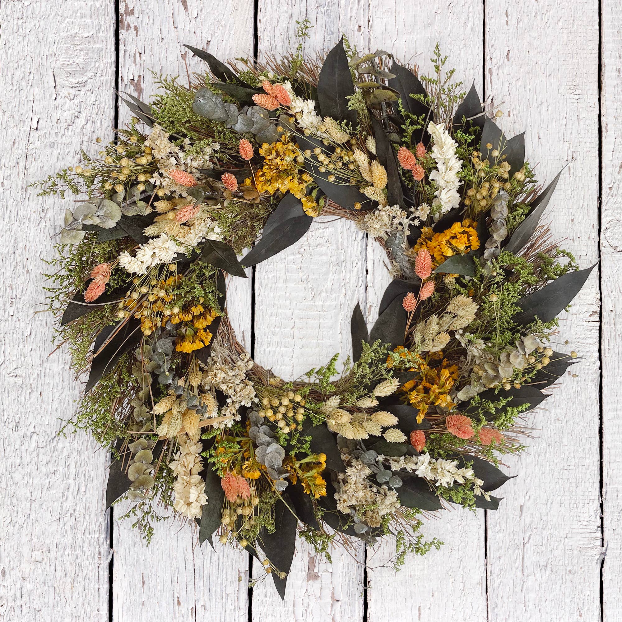 Using natural willow and baby eucalyptus and multiple types of delicate dried flowers, we hand made this delightful and elegant Saratoga Wreath that fits perfectly with any decor. - 19" diameter