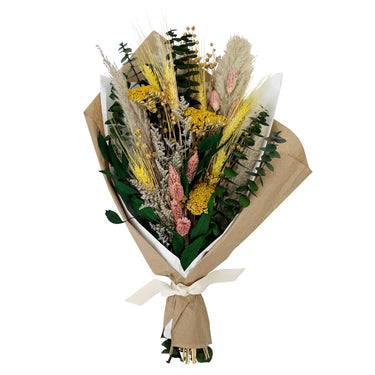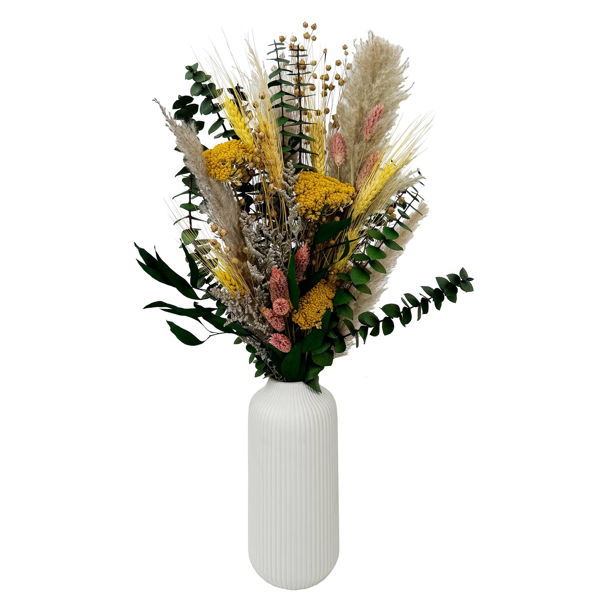 Utilizing both fresh blooms and preserved eucalyptus, Andaluca’s expert floral designers have crafted a luxurious bouquet with a blend of baby eucalyptus, pampas grass, yarrow, wheat, and flax. Handmade in Andaluca’s California studio, each arrangement measures 20 inches in length and is proudly grown, designed, and made in the USA.