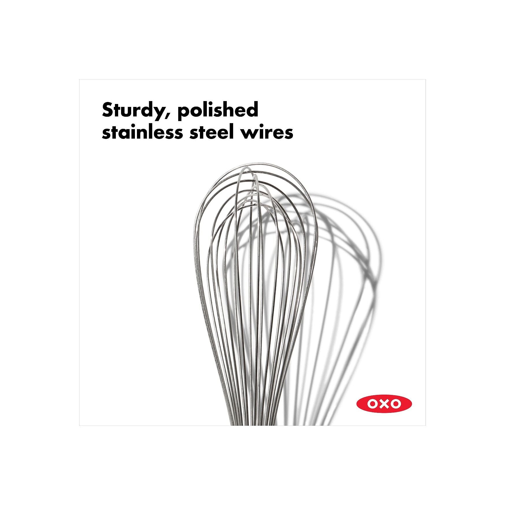 Our Whisks feature polished stainless steel wires and teardrop-shaped handles that fit comfortably in the palm of your hand. The soft handle won't slip even in wet hands.