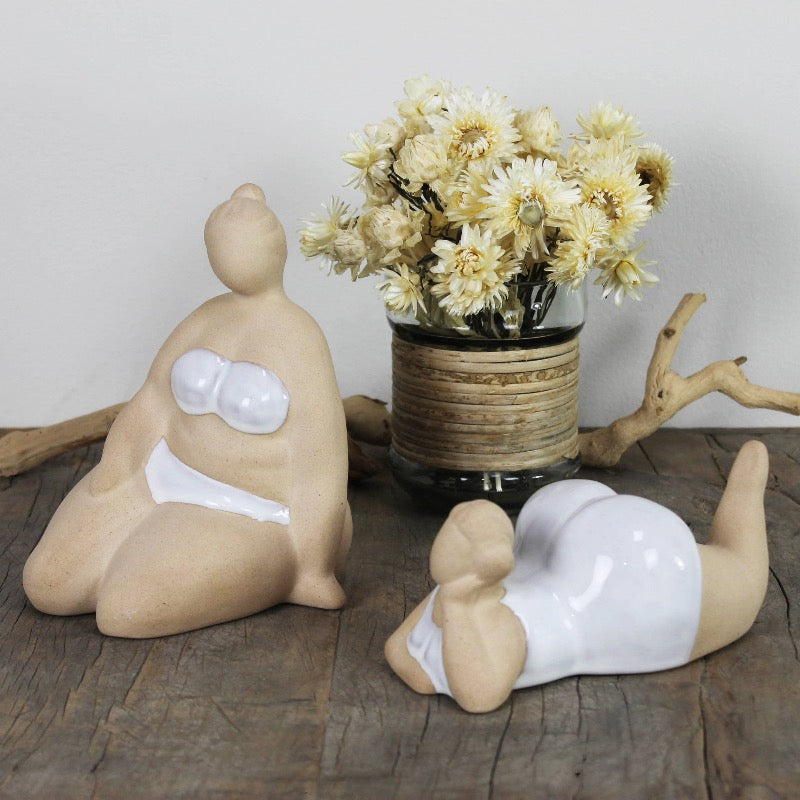 Imagine her, peaceful smile on her face, lounging poolside in the sun. This ceramic sunbathing lady brings a joyful energy to any stack of books or shelf ledge.