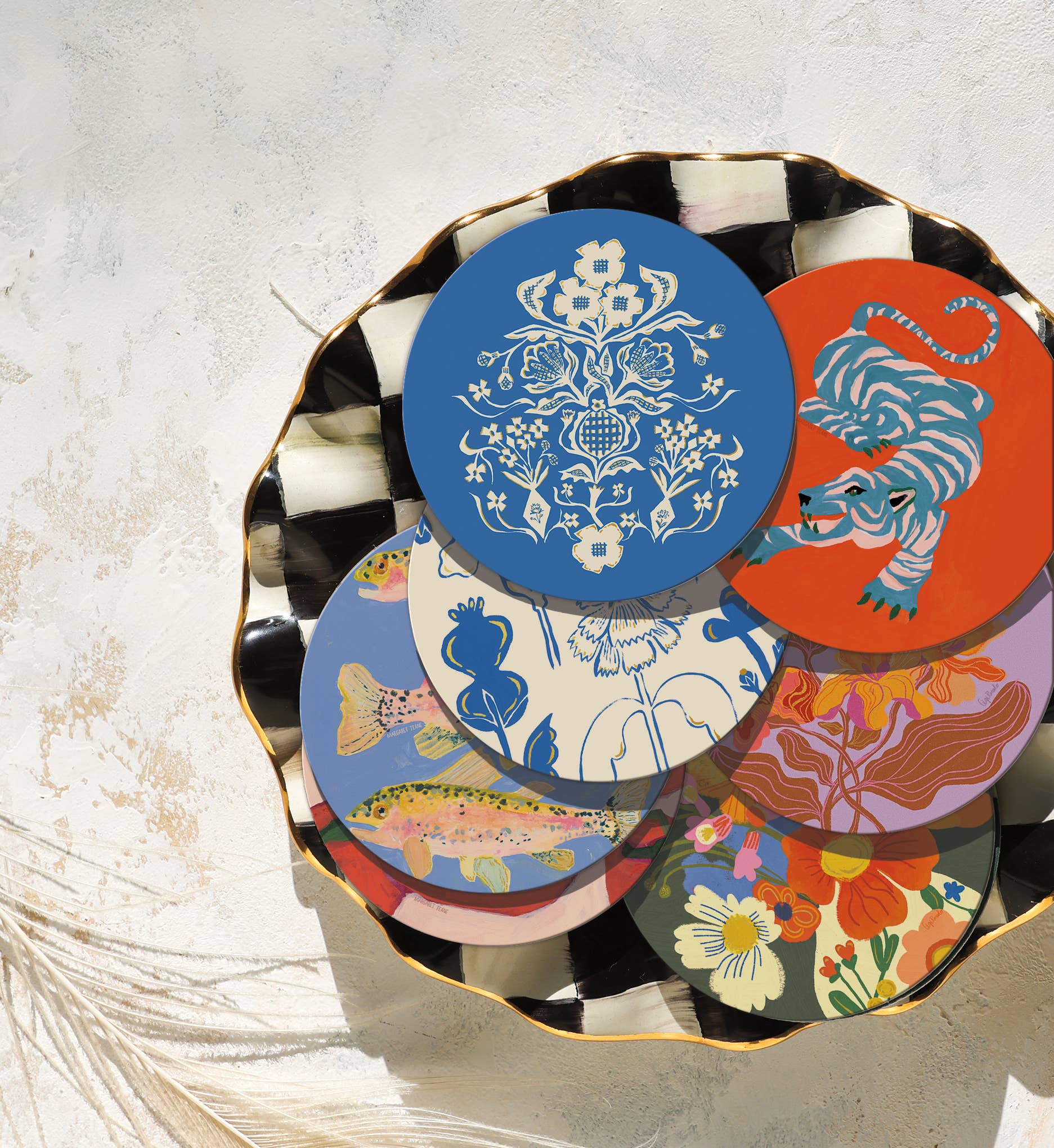These cheery coasters feature hot foil stamped designs, which are corked-backed and heat + water resistant.