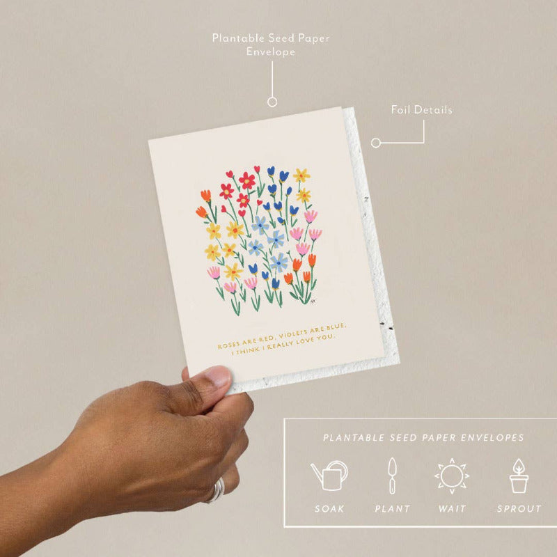 All Seedlings greeting cards have a PLANTABLE seed paper envelope which is embedded with non-invasive wildflower seeds. This seed paper is made of a biodegradable eco-paper created with post-consumer materials - no trees harmed for this paper! When planted, the envelopes compost away leaving only flowers behind.